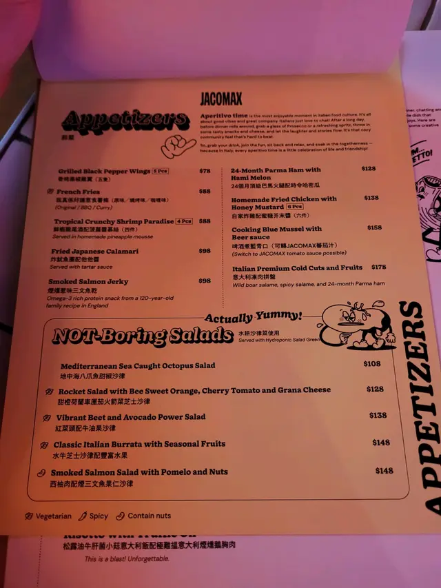 We came to explore the restaurant after watching Jacopo's video 🤭 It exceeds my expectation 👍💕It has variety of dishes and drinks, in range of prices, polite staff. The veggies are fresh, the fried chicken is crispy outside and juicy inside, with nice sauce.The salad is well presented, just that I don't find the egg quite matched to the avocado or beet root. I am not a fan of pineapple pizza, still I gave it a try (Indeed I intended to order apple ..... my mistake). I like smoked salmon pizza with capers. I noted the passion of the family to run the restaurant, keep it up, I will return. If I walk into a trattoria or shop in Italy, they always look into your eyes and greet. HK has a busy culture, I do appreciate Jacomax staff who brought us a drink and confirmed to whom before he put it on the table.…Read More