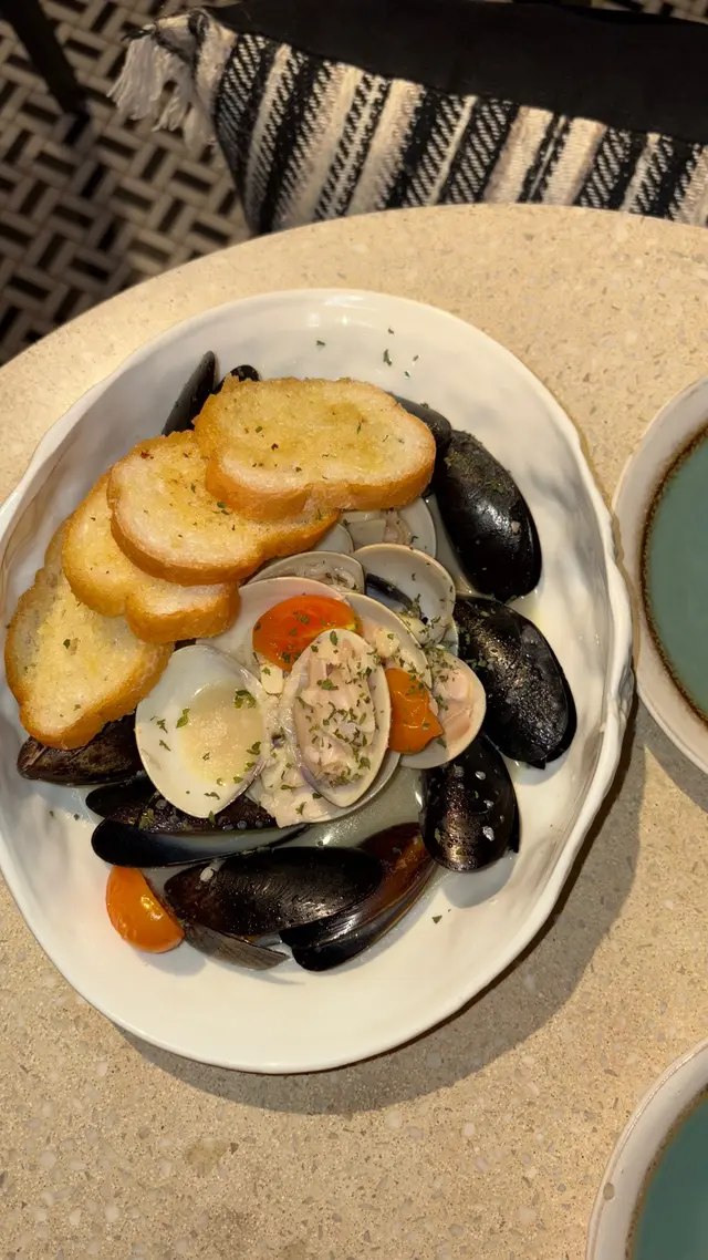 餐廳位於尖沙咀中心地段,環境設計時尚,分為室內和室外區域。室內以開放式玻璃屋的風格,讓人感覺如置身於戶外~無論想要享受陽光或是避開人潮,這裡都非常適合,特別適合女生聚會、下午茶或者慶祝生日,真係Chill到爆!🍹餐廳提供多款意粉、扒類美食,仲有各式酒類同咖啡,價位合理,無論是約會定係同朋友聚餐都好合適。招牌菜包括蒜香牛油汁藍青口、炭燒紐西蘭羊骨扒、特色火焰德國咸豬手等,真係令人垂涎欲滴。🍝 蒜香牛油汁藍青口及蜆碟子上盛滿新鮮藍青口同蜆肉,搭配香濃的蒜香牛油汁,味道真係一流!用香脆的法包蘸住湯汁,食落去好過癮。彈牙的意大利粉裹著濃郁的龍蝦汁,橙紅色澤好吸引,蟹肉新鮮又甜美,令人一試成主顧!🦐 龍蝦汁蟹肉意大利粉每條意粉都掛滿橙紅色龍蝦汁,廚師處理得好好,味道濃郁,份量夠2個女仔食,真係唔會失望