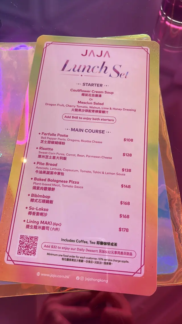 位於灣仔的 JaJa 是一間充滿活力與創意的素食餐廳,裝潢色彩繽紛,pink pink 🌸打卡位十足。餐廳主打健康又美味的植物性料理,如松露意粉和素版漢堡,口感豐富且充滿驚喜。甜品如抹茶蛋糕更是令人一試難忘。整體用餐環境輕鬆愉快,服務熱情周到,是健康飲食和拍照打卡的好去處!🌸🧚♀️✨💛🌟…查看更多