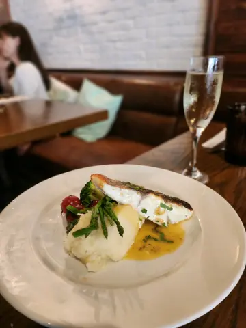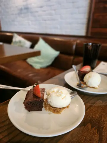 好想食tea見門口有張巨大poster就去問下原來已經無供應等我空歡喜一場不過原來lunch都有半自助每人可以攞一隻碟攞一次沙律吧睇你一次裝到幾多野啦沙律bar選擇都好多有泰式木瓜沙律、薯仔沙律、生果等等我覺得所有沙律調味重手咗啲而且隻碟比較細主菜方面我叫左鱸魚我同事叫左豬扒主食味道反而輕手wo不過食魚清清地都OK嘅最緊要肉夠滑同埋皮夠脆已經食到好飽仲有個唔錯嘅甜品食下香草雪糕加chocolate brownie