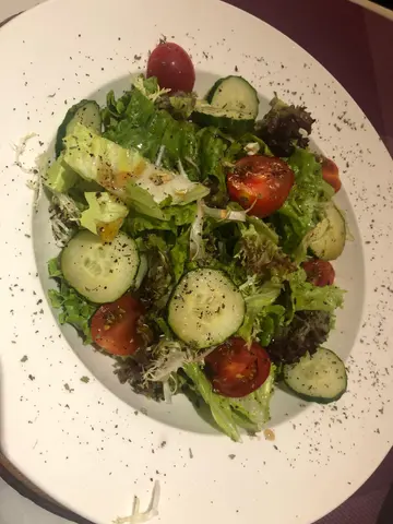 告別晚餐我們三人分別點了一個SetB omakase和一份SetA二人餐另外加點個巴基斯坦焗薯和一杯熱的蘋果茶想說不用自己想吃什麼好廚房發辦可能有新驚喜始終自己跟西餐不熟哈哈很濃郁的蘋果香呃。。是一小杯試試看哇超香濃勁香濃好香濃二人餐來一碗例湯搾幾滴青檸汁更加清香然後是沙拉味道不重很清澈碟子撤滿香草