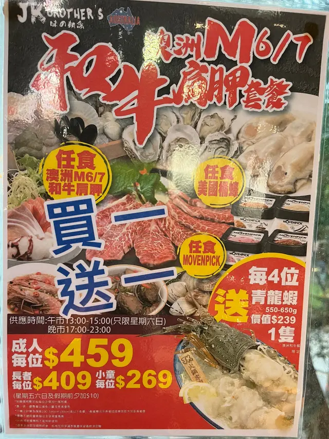 15/2/2024人日+團拜+補祝1月生日朋友 ~ 選擇去佐敦嘅 JK Brothers , 之前我已經食過2、3)次,印象吾錯。之前仲有得自已喺水缸‘夾’活生生海蝦、撈蜆,不過衣家好似冇咗呢個位置。上網見佢做結業優惠,$188 per head 2.5 小時任食任飲 (另加錢任食醬油鮑魚醬油蝦,不過同行朋友麻麻哋,所以我哋冇加錢)好似話租約去到三月、四月。我哋五個人坐一張六人枱,分配咗兩個爐,所以可以揀兩個唔同鍋嘅湯底。不過其實都有啲迫夾,因為枱面唔算好大,放咗兩個爐之後真係冇乜位置,尤其係當點咗嘅嘢食一齊上嚟嘅時候。肉類嗰啲就用QR code , 跟住出邊都有啲熟食、丸類、餃子類、蔬菜自己夾。普通品牌嘅雪條雪糕都任食。Happy …查看更多
