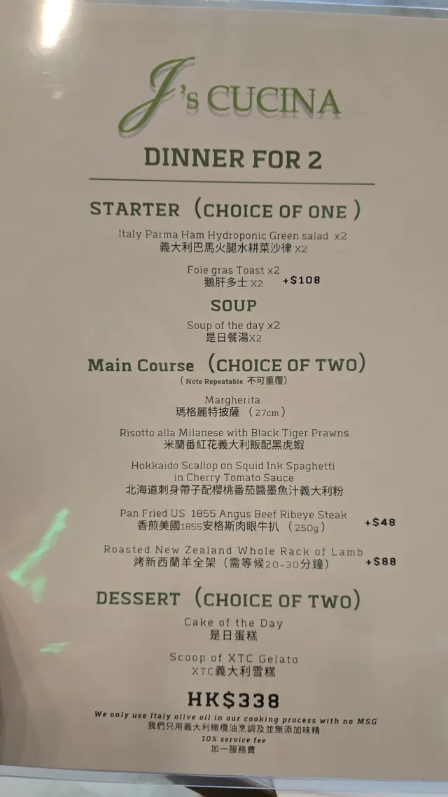 今日同朋友特登嚟到荔枝角瓊林街呢座打卡大廈試佢哋個Dinner 🔍🍽️ Dinner for 2套餐 包8道菜:$338• 前菜:意大利巴馬火腿水耕菜沙律是日餐湯 • 南瓜湯• 主菜:米蘭番紅花意大利飯配黑虎蝦北海道刺身帶子配櫻桃蕃茄醬墨魚汁意粉• 甜品:是日蛋糕 • 芝士蛋糕XTC意大利雪糕🍸 單點CocktailAPPLE GIN $72(Happy Hour半價後 $36)呢杯好清新, 蘋果香同Gin酒好夾, 推介!BORAMISU $88(Happy Hour半價後 $44)呢杯超正, 表面上係tiramisu, 但裡面係但係有點酒精嘅飲品, 所以味道好刺激 😍整體嚟講:• 巴馬火腿沙律鹹香開胃• 墨魚汁意粉掛汁力強, 帶子鮮甜• 虎蝦Risotto煮得剛好, 飯粒有咬口人均只需$250左右, 係呢個度算係合理價, 環境舒服, 配合落地玻璃, 採光極好, 黃昏時效果更佳, 食物有誠意, 可以encore 👍🏼…查看更多