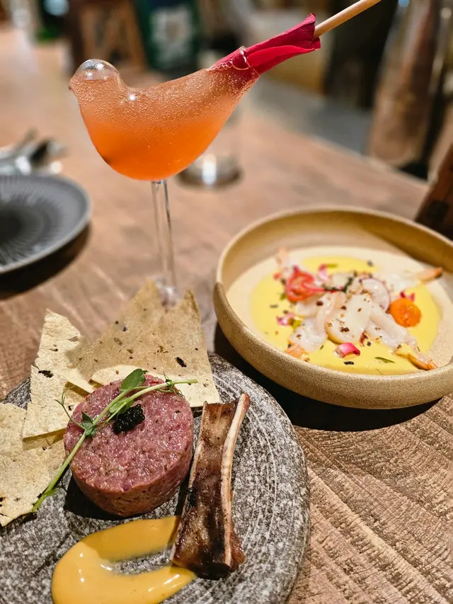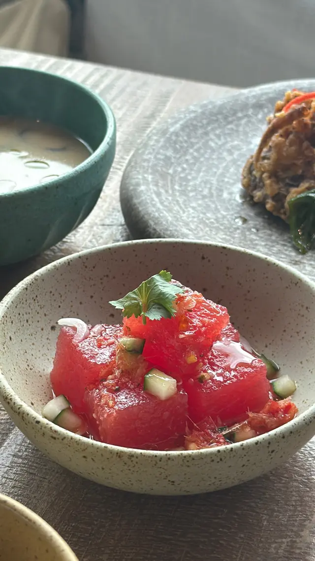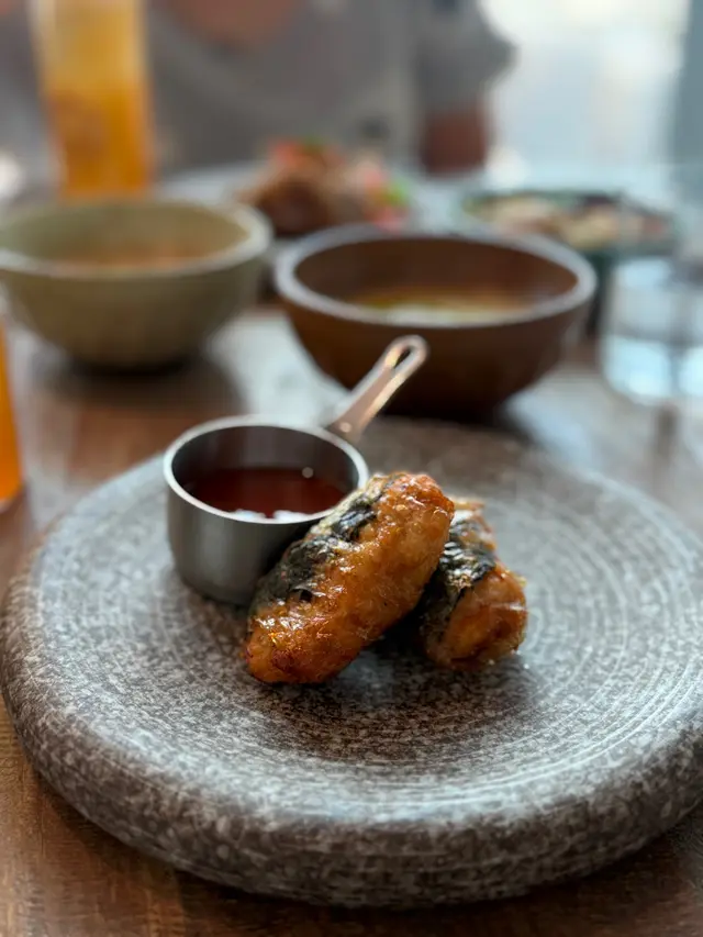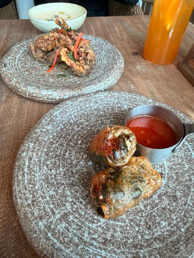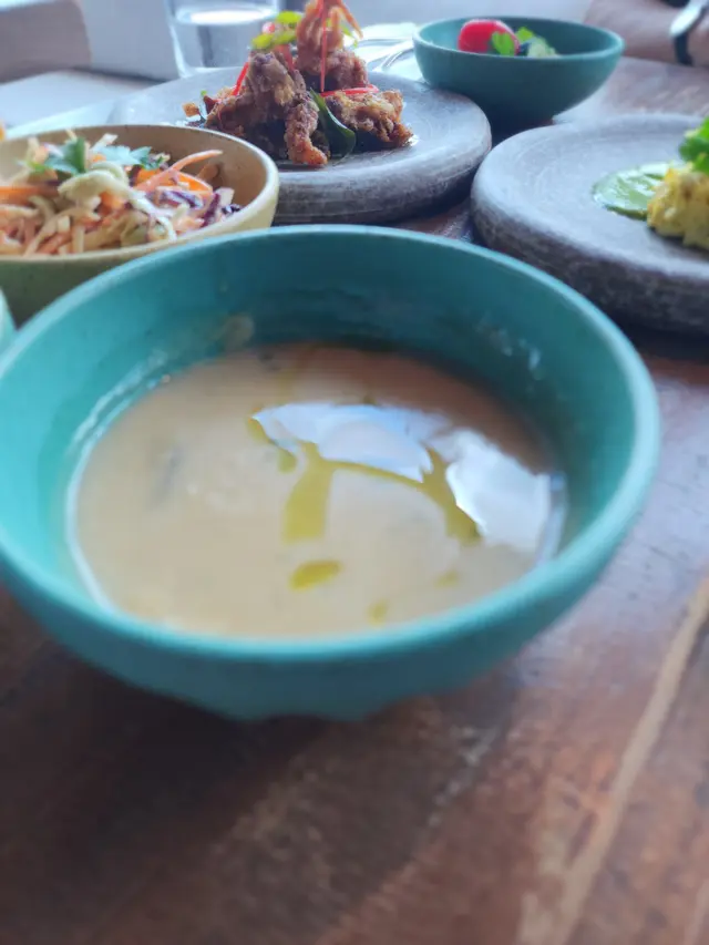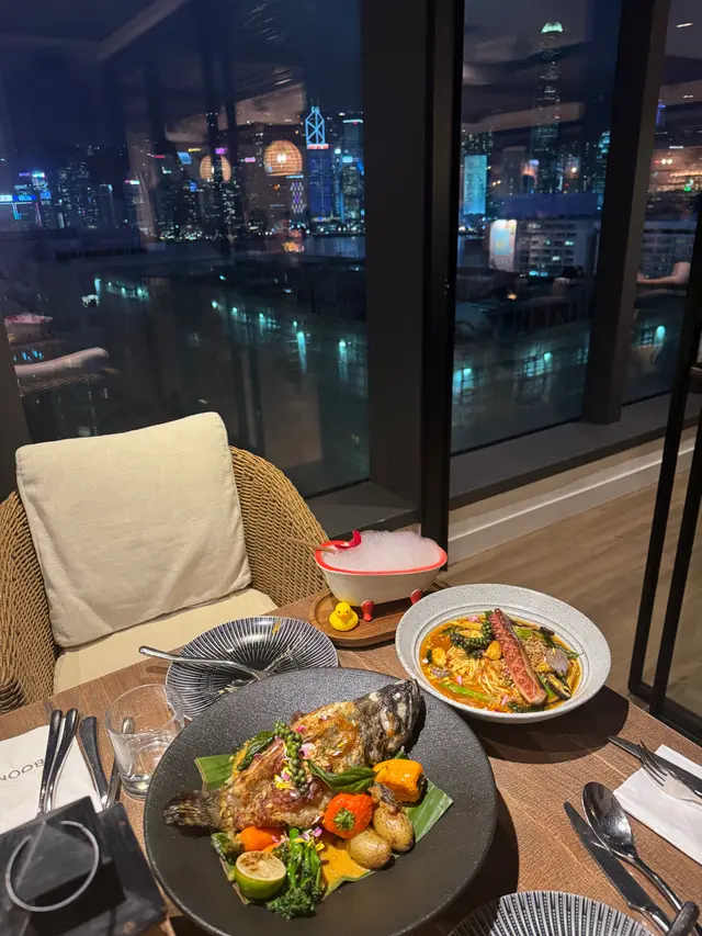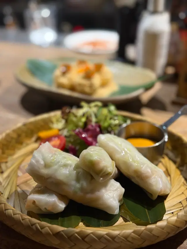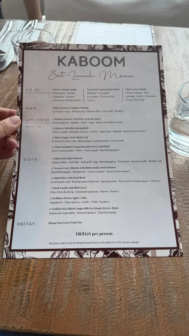 今日又同大家姐去位於尖沙咀北京道,環境優雅,遠望維景Veiw,而且充滿泰國風情兼有濃濃渡假feel 嘅泰國fusion餐廳「Kaboom」食親民價$128 起既4-Course Set Lunch😋Salad 🧿Thai Crunch Salad帶點花生味的醬汁涼拌紫椰菜絲、蘿蔔絲及枝豆,味道清新爽口開胃。🧿Sous-vide Watermelon Salad 慢煮西瓜好特別,又甜又juicy,配埋青瓜食,爽口又清新。Soup🧿Thai Coconut & Chicken Velcute入口陣陣椰奶香,湯底濃郁而不膩,湯料嘅雞肉同菇菌都好好食,口感十足。Appetizers🧿Black pepper Soft Shell Crab(add on $30)軟殼蟹炸得夠乾身,香脆可口,有埋黑椒更加美味。🧿Sniso & Cuttlefish Spring Roll (add on $30)紫蘇葉包住墨魚肉炸,好似春卷咁,見到已經流晒口水,墨魚肉彈牙有嚼口,入口更帶點紫蘇葉香,蘸上酸甜汁,更顯泰式風味。Main 🧿Laksa With Tiger Prawns虎蝦好大隻,烤過嘅蝦特別香,魚蛋彈牙,豆卜同麵吸晒叻沙湯嘅精華,仲有半隻雞蛋,真係好足料。🧿Baked Rice with Pork Rack用車厘茄、芝士嚟做醬汁,味道濃郁,酸甜開胃,厚切吉列豬鞍架,外脆内嫩,肉質非常軟腍,配蝦醬炒飯,真係無得輸😋Drinks🧿House Earl grey Fruit Tea好有陽光氣息嘅飲品,除咗伯爵茶香之外,亦有熱帶水果嘅味道,好飲。…查看更多