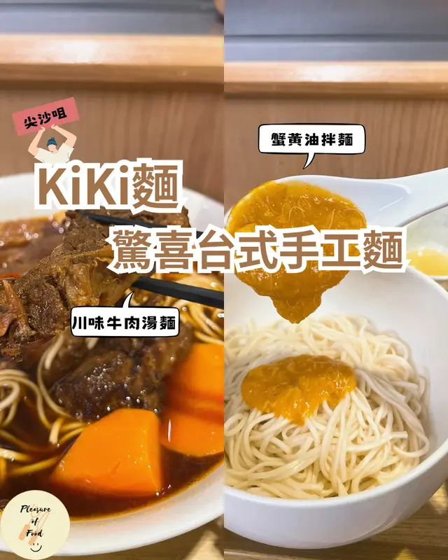 🔸Kiki麵🔸🔆大家可能覺得點解又係Kiki麵,之前的post我係介紹Kiki麵的飲品。今次終於有機會坐低食啦~我地超級肚餓,所以叫左2個$148全日套餐,套餐包括一份小食+一份主食+一杯飲品~🔆涼拌鯛魚皮+蟹黃油拌麵(+$10)+紫薯鮮奶(+$18) $176👌🏻涼拌鯛魚皮 鯛魚皮非常彈牙,不過有小小硬,要咬多幾啖先好吞呀。醬汁好惹味,有啲好似泰式風味,酸酸辣辣。👍🏻蟹黃油拌麵佢碗蟹黃係分開上的,都幾大碗,成碗倒落幼麵到,撈到每條麵都有蟹黃就啱架啦。蟹黃味好香濃,落埋佢比嘅醋同麻油,再加左唔少風味。麵條幾爽口,每啖都食到蟹黃的顆粒同小小蟹肉。🐭今年無食到大閘蟹,係到滿足番自己條蟹癮🤣🤣👌🏻紫薯鮮奶鮮奶味幾濃,但紫薯蓉唔夠多,味道較淡。🔆煙燻無骨鳳爪+川味牛肉湯麵+白桃烏龍 $148👍🏻煙燻無骨鳳爪鳳爪好爽脆好好食,佢個醬汁微辣,味道有啲似戟汁醋肉乾咁hahaha,成件事好match!! 👌🏻川味牛肉湯麵幼麵爽滑,湯底食得出川味的麻香,亦唔會太鹹。牛腩有小小鞋,但overall牛味幾濃,都唔錯。👍🏻白桃烏龍白桃烏龍清香,啱哂食完濃味野再飲!🔆Overall非常滿足,晚餐$148嘅set覺得合理,可以再番黎食!🔆Pleasure指數(滿分5粒🤩)🐭小姐:🤩🤩🤩🤩+0.5🦁先生:🤩🤩🤩🤩+0.5📌地址:尖沙咀梳士巴利道18號維港文化匯K11 Musea 4樓406號舖🎐Foods are powerful🎐#Pleasure食#Pleasure尖沙咀#Pleasurer#hkfoodie #foodie #hkfood #hkeat #food #foodstagram #hongkongfood #tsimshatsui #K11musea #noddles #taiwanese #kikinoddle #kiki #尖沙咀 #台式 #尖沙咀美食推介 #尖沙咀美食 #牛肉麵 #蟹黃麵 #拍拖好去處 #朋友聚餐 #好食 #美食推介 #kikinoddlebar #Kiki麵 @kikinoodlebarhk查看更多