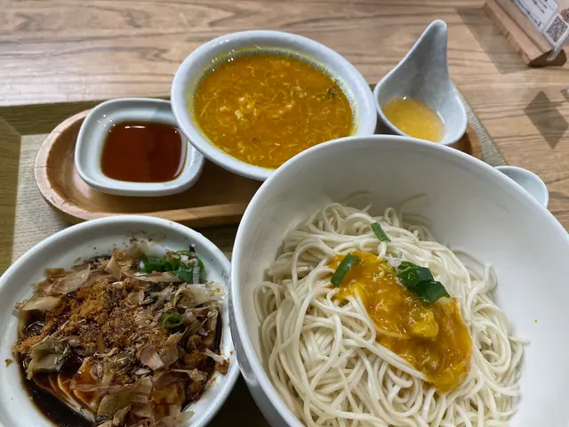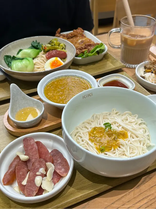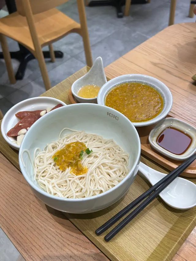 每次經過「kiki麵店」都被他們的麵深深吸引,終於有機會試試!必點特別推薦的風沙燒松阪豚肉拌麵,果然沒有讓我失望。豚肉的質量上乘,外表微焦,裡面保持著肉汁鮮嫩。配上他們特製風沙調味,味道非常入味,有bbq豬頸肉的滿足感!麵條方面,手工製作真的口感彈牙,超有咬勁。麵條吸收了豚肉和辣醬汁,香氣撲鼻,確實是拌麵的靈魂所在。還點了一個蟹黃醬拌麵套餐,套餐裡還搭配了多款小食和特調飲品,好豐富。蟹黃醬超濃郁鮮甜,creamy的口感為整道菜增添了不少風味,令我印象深刻。但小食台灣腸就給比下去了😂最後,怎能不提他們的「kiki茶」?這杯茶真是解膩又提神,搭配拌麵食用更是絕配。查看更多