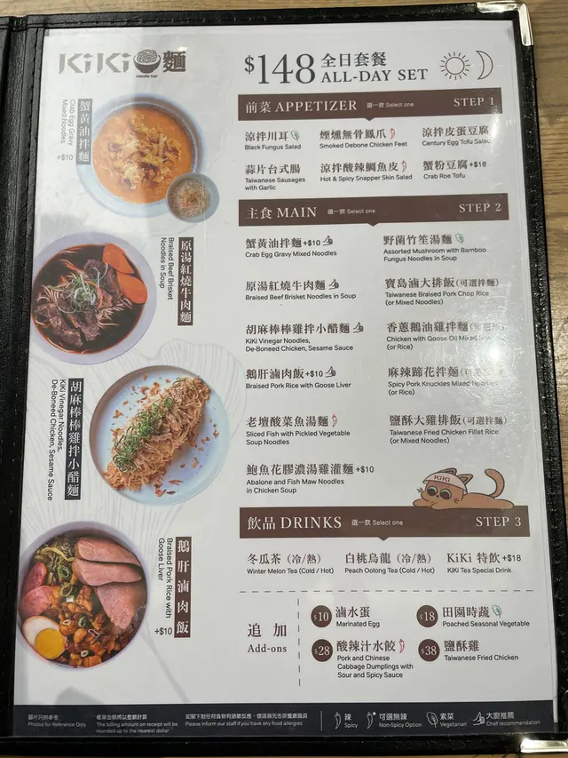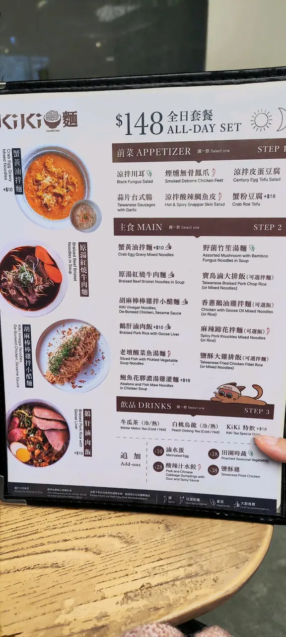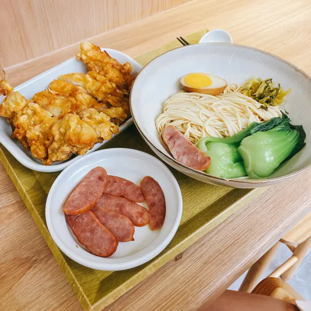 本身想食個間full哂,又有少少趕時間,見到K11 musea 有間Kiki麵,朋友話未食過一直都想試下,剛好我都未食過就試下.全日套餐 $148有一個前菜+一份主食+一杯飲品前菜我就揀左蒜片台式腸,而主食就叫左蟹王油拌麵(+$10),飲品就叫左白桃烏龍 .碗麵入面本身有少量蟹肉同蟹膏,個餐附上蟹黄油、蟹黃蟹肉同埋醋,可以按自己喜好加入拌麵到食。每啖都食蟹黃醬幾鮮味,幾creamy 。台式腸幾香口,白桃烏龍茶味較重,唔太飲到白桃味。.全日套餐 $148呢個餐就叫左盛酥大雞排伴麵,可以叫飯。不過食得Kiki麵就叫返佢哋個招牌-伴麵。雞扒份量勁大份炸得幾香脆,個麵就普通。查看更多