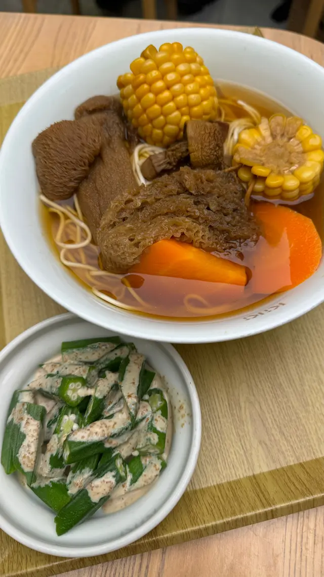 同事呢排齋戒,喺Musea搵素食真係唔係咁容易。事關佢係連五辛都戒緊 。點知今日發現咗Kiki面,原來有一碗竹笙麵,非常之啱佢,就陪佢過嚟lunch啦!起初都覺得食一碗素菜麵百幾蚊呢個價錢偏貴,但係原來好足料,加埋個前菜係麻醬秋葵,食完佢都好飽。而且味道好好,希望多啲餐廳日後都可以提供到有齋菜嘅選擇!飲品冬瓜茶,中規中矩。以後都仲會過嚟幫襯!查看更多