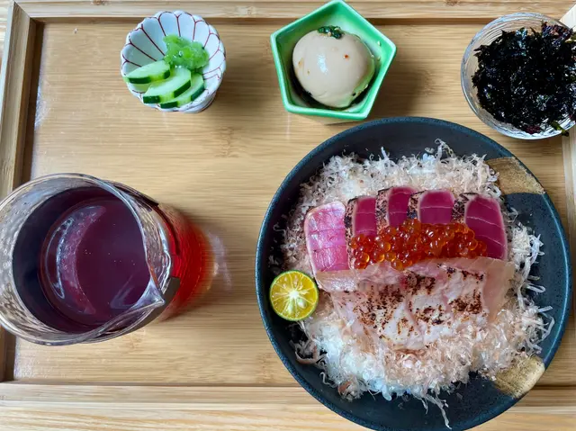 醬油漬吞拿魚鯛魚茶泡飯 ($120) ★★★★✰配麻藥蛋、芥末莖漬同上面嘅鯛魚一樣,醬油漬吞拿魚同出面高級日本餐廳食到嘅感覺無異,而且切得每片有1 cm厚,食落好滿足。飯上面有好多木魚絲都加強成道菜嘅魚鮮味。茶湯係類似烏龍茶底,連埋青檸汁加吞拿魚都幾好餸飯。芥末漬物好刺激攻鼻!醃蛋就睇相片都知熟度啱啱好。假日無lunch set,只有$120一道主食午餐無包飲品,不過店內可自行斟水,亦有自助餐具同領紙巾處。座位同整體環境好舒服,裝修好有春天和風拂面嘅感覺,仲要係pet-friendly。以南豐紗廠嘅消費水平嚟講價錢絕對可接受,而且食物幾有質素,值得推薦