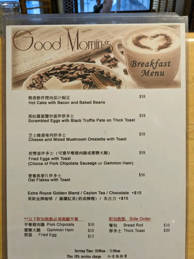 在銅鑼灣想搵個比較企理地方食早餐,我會去11樓 Sogo club,款式唔多,亦唔係茶餐廳餐牌,比較輕食,但杯咖啡真係好飲,地方寧靜,服務也很好,唯一係等食物比較要有耐性,人多要預15分鐘才送到。