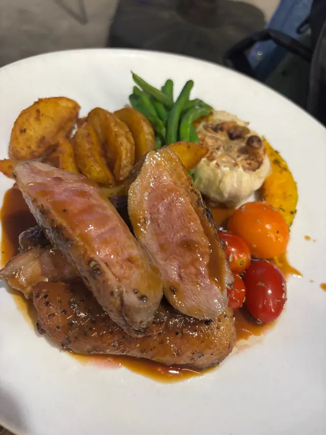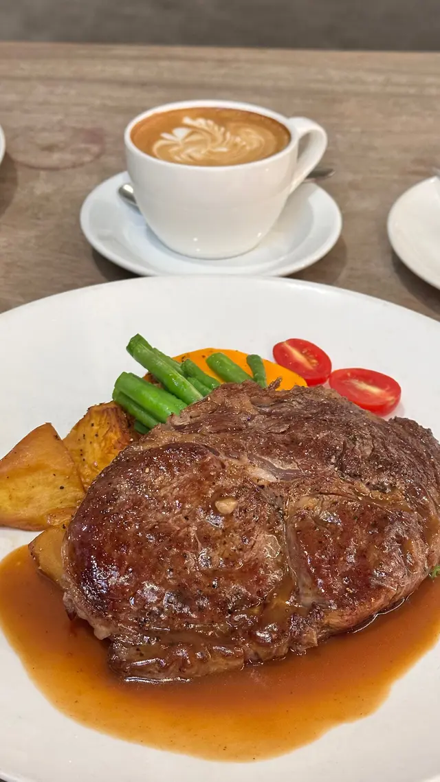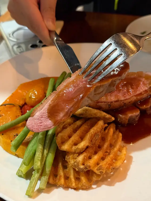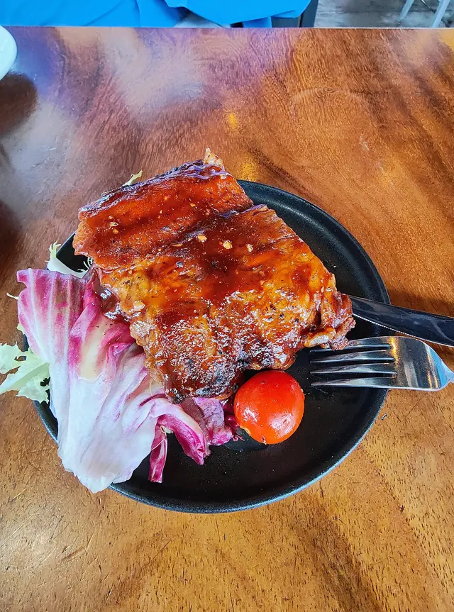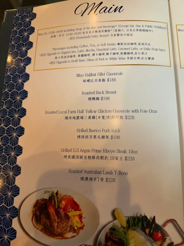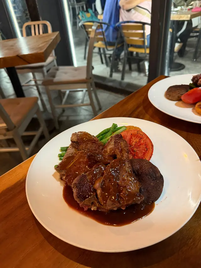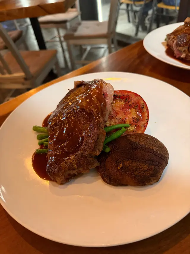 觀塘海濱可以看見海岸線的落地玻璃餐廳簡單燈飾點綴玻璃屋設有室內外位置室內輕快音樂柔和燈光室外陣陣海風 配上無邊際海景烤美國頂級安格斯肉眼扒 五成恰到好處誘人的焦褐色,內裏嫰紅肉眼扒配上濃郁的醬汁撒上黑胡椒增添風味,伴菜青豆薯餅,烤蘑菇色澤金黃,質地柔軟多汁,半顆微燒蕃茄,兩種蔬菜與主菜搭配得宜,營養均衡且視覺上吸引人。燒澳洲羊T骨七成 保留了煎香脆皮伴菜豆角保留了蔬菜的清脆 ,薯餅伴菜青豆薯餅,烤蘑菇色澤金黃,質地柔軟多汁,半顆微燒蕃茄,兩種蔬菜與主菜搭配得宜,營養均衡且視覺上吸引人。兩種肉類都整體擺盤簡單卻具有層次,色調搭配適宜,令人食指大動,品質不錯的餐點。邪惡誘人的薯條,剛炸起的幼身薯條,薯條呈現金黃色質地酥脆,香氣撲鼻,配上番茄醬和黑松露醬,作為配菜增添風味,適合與朋友分享。哈密瓜火腿熟成火腿搭配新鮮哈密瓜相得益彰,適合作為開胃菜或輕食紅石榴水果茶,淡淡清香果香,配上石榴果實焦糖咖啡,恰當好處的焦糖香…查看更多