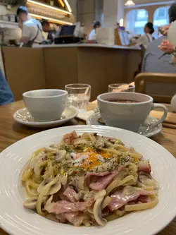 Latter Cafe今日試左Latter Cafe lunch set。 店內裝修用暖色日系風格,燈光佈置俾人一種溫暖舒適感覺。餐廳主打係咖啡,all day breakfast 同埋意粉。今次就嗌左兩個意粉lunch set。所有野所係即叫即做,落單後大概等左半個鐘有多先黎齊。1.Carbonara+牛奶朱古力Carbonara個汁creamy,足夠之餘又唔怕水汪汪,賣相吸引,菇beacon洋蔥一d都唔少,同埋有煎香過,但同意粉一齊食個陣就食唔到陣becon味,意粉煮得較硬身,但都會掛到汁,總體黎講不過不失。牛奶朱古力有拉花,有心思。蟹肉蛋黃意粉+美式咖啡蟹肉都有一大堆係意粉上面,食前同蟹籽同意粉撈勻左,唔係食得出蟹肉味道。個意粉有上沾有咸蛋黃,食落去食最出嘅係呢個味。煮嘅時候亦加入干辣椒,意粉會有少少辣,意粉較硬身。如果唔食辣嘅話可以係點餐時揀選走辣。美式咖啡,口感唔會苦澀,但有咖啡香味,總體都不錯。兩個set連加一$303,灣仔算係中上價位。…查看更多