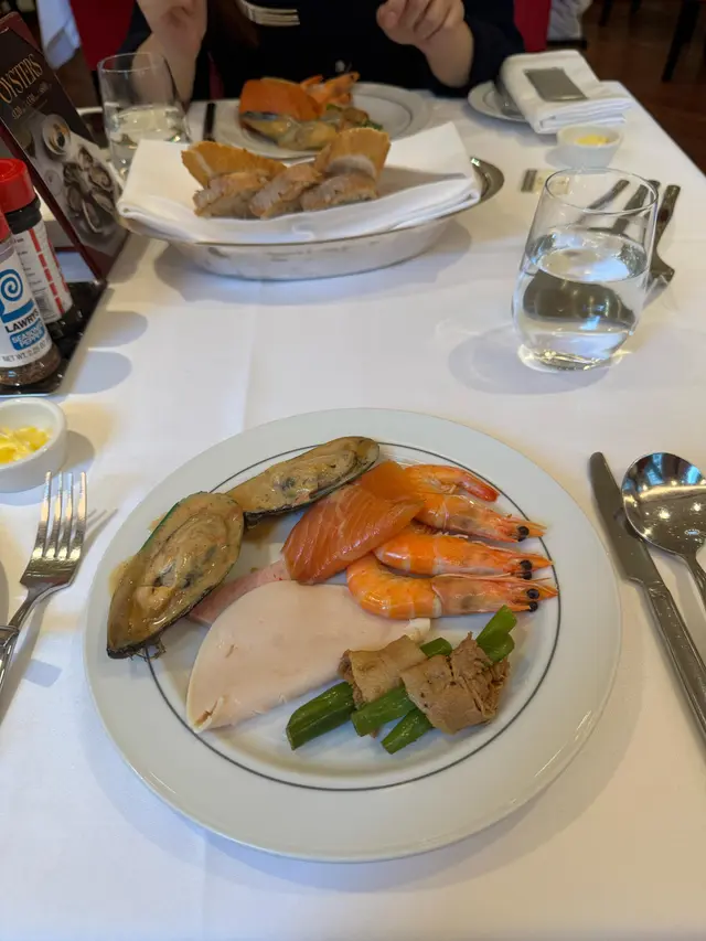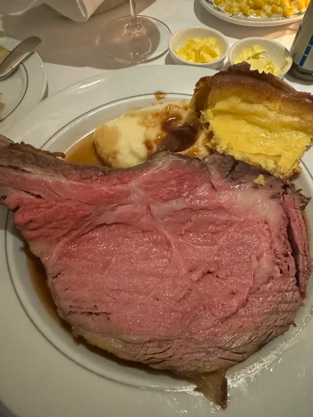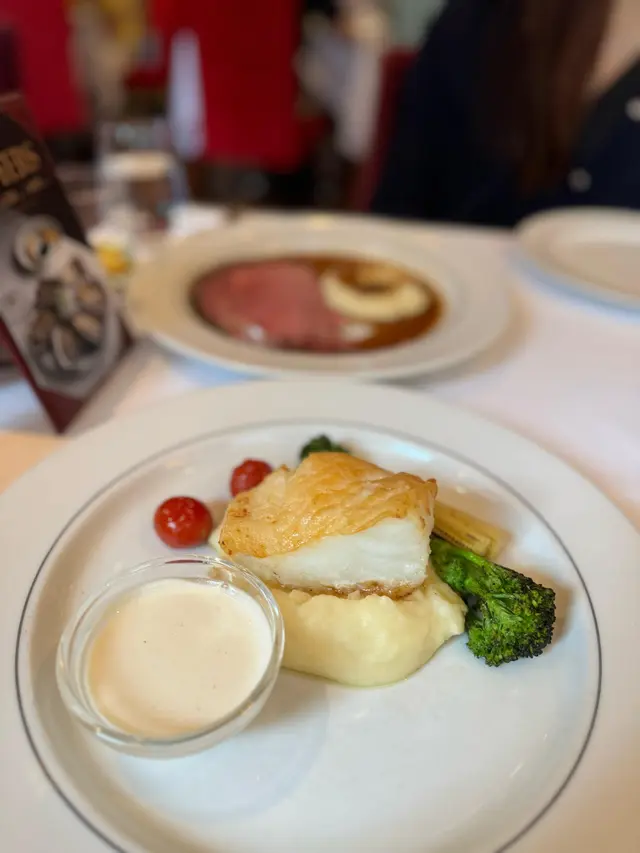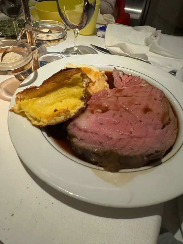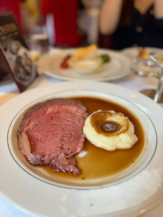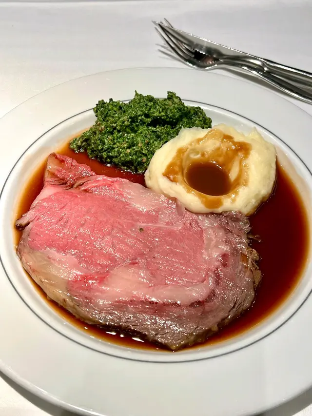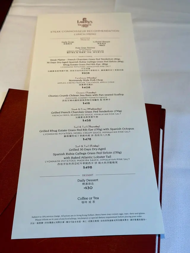城中最著名吃Prime Rib的餐廳非Lawry's莫屬。美國的元祖店已有超過80年歷史。早就想一試呢間餐廳,所以趁生日前預訂了HSBC Premier Dinner Set,$1388兩位。餐廳位於中環,內部裝潢典雅,但有點舊。侍應服務很好,入座時要了支still water,索價$95一瓶。餐前有杯柚子清酒泡沫作開胃小品。麵包有水準,暖身且外脆內軟,牛油亦好香。頭盤為海鮮三重奏,有魚子醬藍蝦他他、帶子撻和蟹肉牛油果卷。當中以藍蝦他他最好食,生蝦爽滑,份量足,配上魚子醬和豉油汁更顯鮮味。冰旋翡翠沙律為Lawry's其中一道招牌菜,十分講究溫度。侍應先派冰叉,然後即席把沙律菜放入不鏽鋼碗,並於碎冰上旋轉拌勻食材。沙律菜爽脆,並有車厘茄和紅菜頭絲,佐以些利酒沙律醬。如果以煙肉代替紅菜頭絲就更合我心水。經典大蜆周打忌廉湯 - 大蜆有4大隻,十分鮮甜。湯也充滿大蜆和洋蔥的甜味,十分好飲。上主菜前先來個青檸雪芭清新味蕾。主菜燒牛肉選了medium rare,由廚師推出招牌不鏽鋼餐車,並即席切出美味的燒牛肉,並配有yorkshire pudding和薯蓉作配菜。燒牛肉嫩滑,肉味豐富,但沒有想像中juicy,可能點rare會比較好。Yorkshire pudding偏鹹和乾,唔太好食。另一道主菜為香煎石斑魚及燒八爪魚。燒八爪魚有碳燒味,軟滑不韌。石斑肉質就比較嚡。甜品為椰香鮮蜜瓜,像蜜瓜肉糖水加上椰子雪糕。味道普通,個人不太喜歡。由於是生日的關係,侍應邊唱生日歌邊送上蛋糕,蠻有儀式感。生日蛋糕都好食,甜度適中且忌廉不多。…查看更多