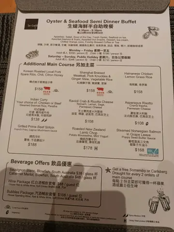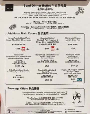 來了來了,勁耐冇食過酒店自助餐!!!今日同母親大人食完,連佢都話正~即刻分享吓✨必食海鮮有師傅專人即開鮮嫩生蠔、松葉蟹腳、凍蝦、青口、翡翠螺!樣樣都有冰坐鎮住,確保住夠晒冰凍又新鮮。每張枱面上面都已經包咗蟹腳專用嘅鉸剪✂️當然唔少得有肥美嘅刺身,除咗有最熱門嘅三文魚之外,亦都有厚切帶子、赤蝦、吞拿魚添。除咗凍食之外,亦都有美極炒蝦、薑蔥炒麵包蟹、雜錦海鮮炒飯嘅款式,歎盡海上種類(⁎⁍̴̛ᴗ⁍̴̛⁎)食到咁上下,職員更加會送上每人半客焗龍蝦🦞奶滋滋嘅味道好惹味✨熟食方面小編好鍾意佢嘅湯品,包括當日有粉葛赤小豆🫘 金銀菜煲豬肺湯,超夠火候!!即燒嘅蜜汁燒豬頸肉、糖醋排骨;大大條蒸魚;濃味咖喱雞;DIY魚蛋粉;以及剛剛已經提及過嘅海鮮🦞✨甜品方面全部都係細細件唔會太重負擔,鍾意佢個百香果慕絲、士多啤梨乳酪蛋糕,兩者都唔會太甜仲有一口葡撻外皮超級酥脆,其他仲包括檸檬撻、士多啤梨千層酥、朱古力噴泉、巴斯克芝士蛋糕!雪糕方面有MOVENPICK,食返兩杯仔回回本(・ω・)ノ⭐️重點重點,紅酒🍷白酒都係任飲⭐️…查看更多