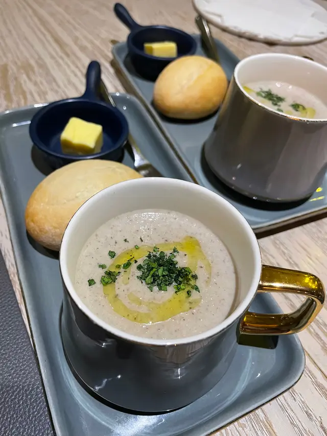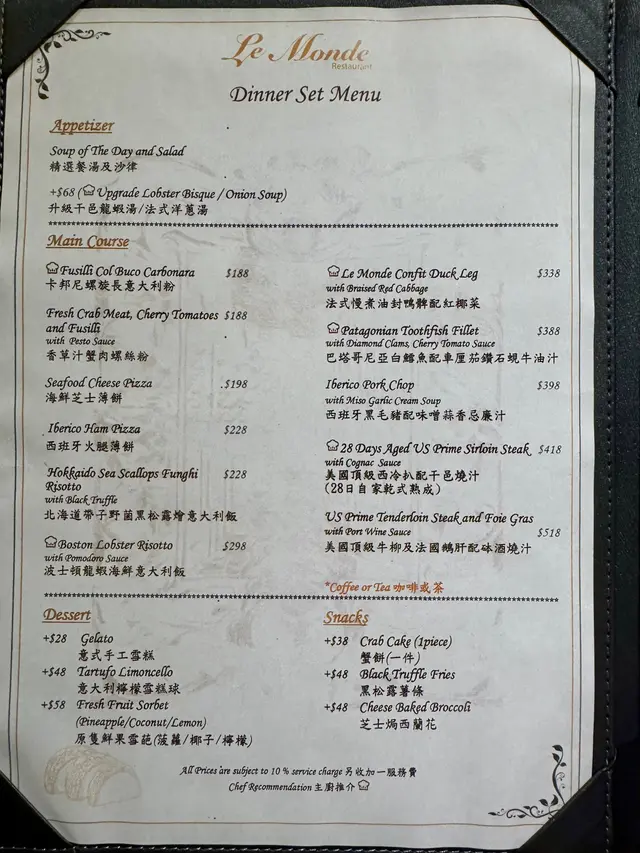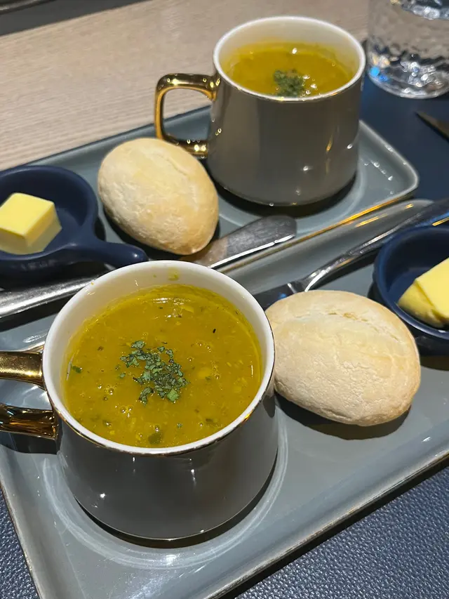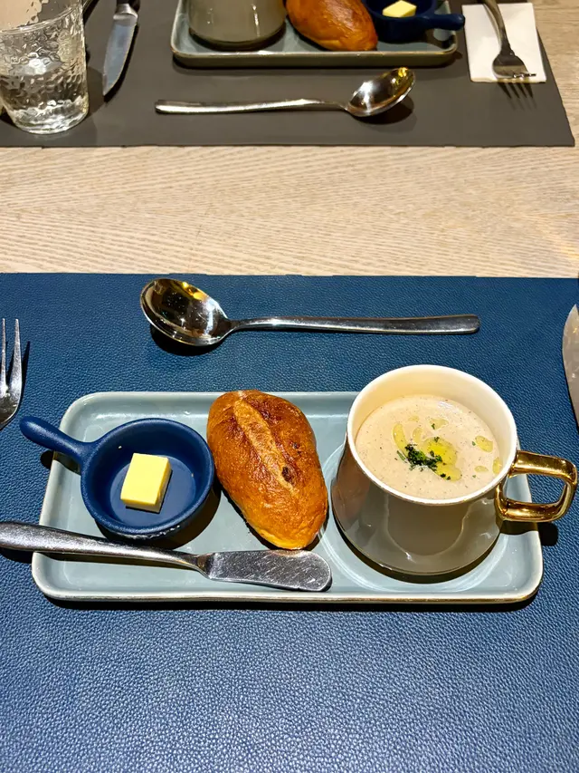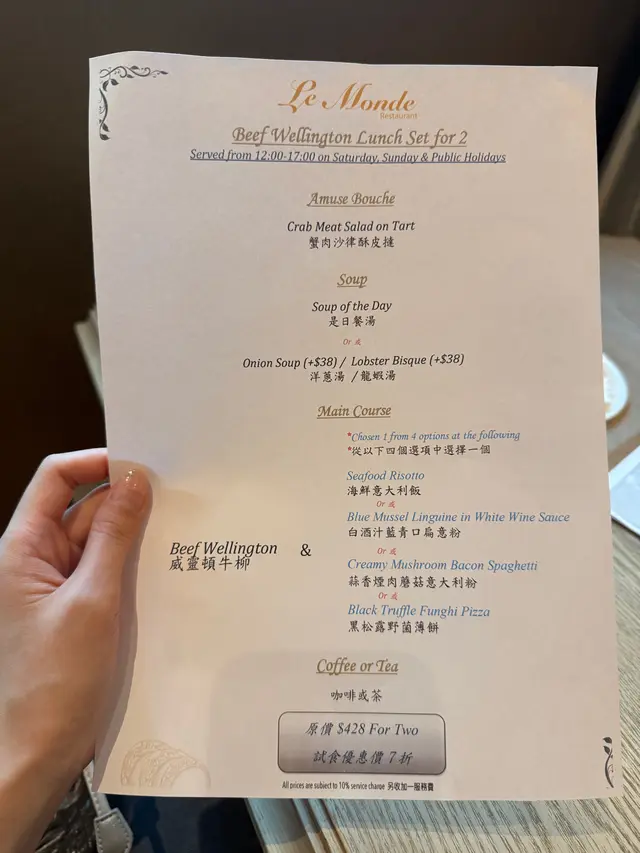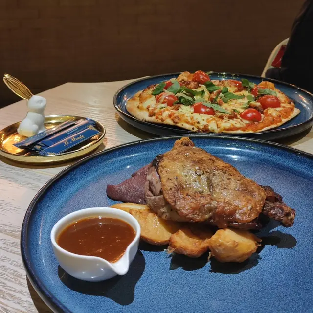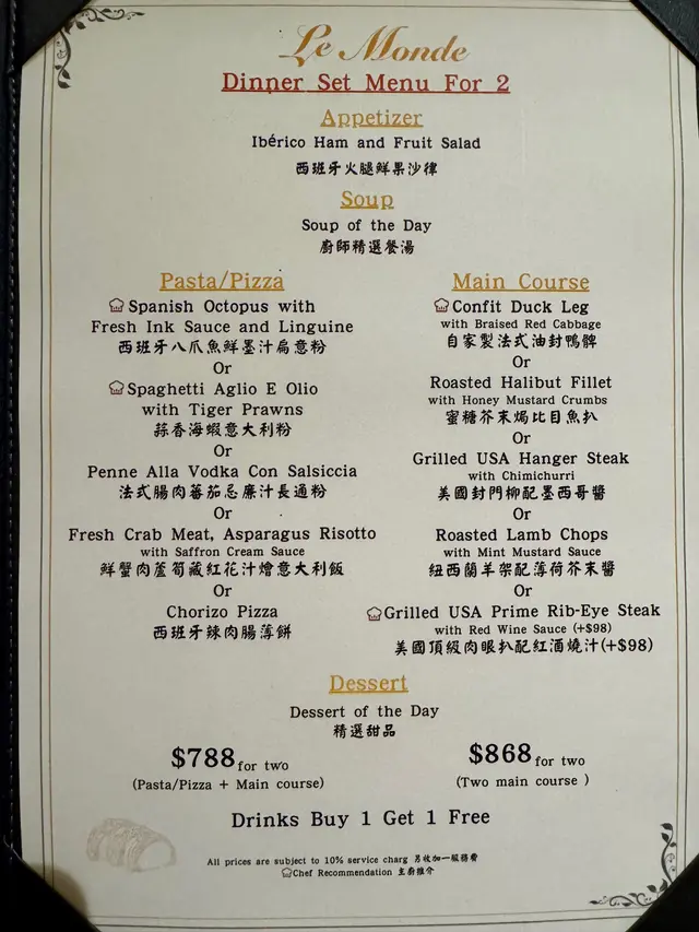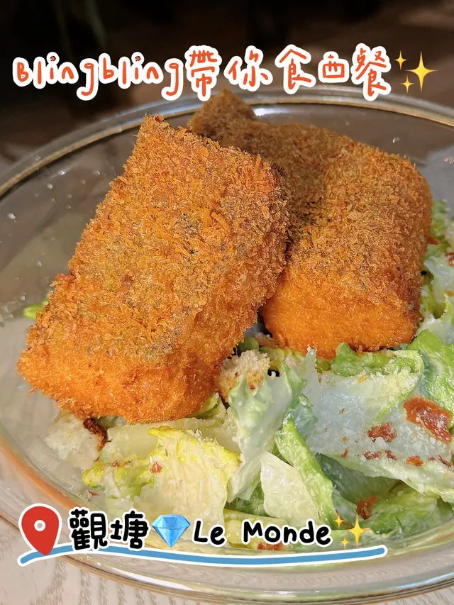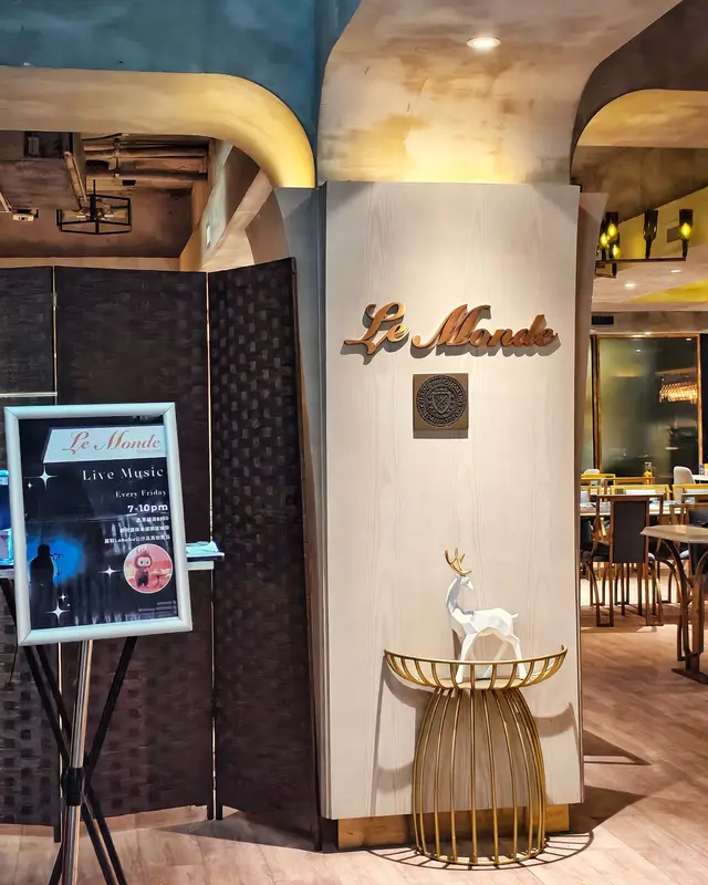 觀塘🚇呢間隱世法式餐廳 Le Monde 🇫🇷 一入到去即刻俾佢嘅環境佈置吸引住✨,灰藍色嘅主調配搭工業風水泥牆身🧱,加上好大嘅梳化休閒區🛋️,同埋 Live Music 舞臺🎤,成個感覺高級得嚟又帶點悠閒😌,真係好適合情侶或者朋友嚟chill吓💑。枱同枱之間嘅空間好闊落👍,坐得好舒服😊,連餐具都好有心思🍽️,每隻碟都印有餐廳名🏷️,細節位都做得好好👌。今次我哋揀咗個法式✌️二人晚餐,食品有多款選擇📋,價錢亦都幾抵💰。首先上場嘅係餐前小點蟹肉沙律撻🦀,呢個撻仔細細粒,但味道好驚喜😲,蟹肉沙律鮮甜creamy🦀,配上鮮味嘅飛魚籽同埋鬆脆嘅撻皮,一啖咬落去😋,口感層次好豐富🌈,真係開胃又好味👏。跟住就係西班牙火腿鮮果沙律🥗,沙律菜新鮮爽脆,配搭多汁嘅鮮果🍓,甜甜哋好清新🍊。最正係嗰幾片西班牙火腿🇪🇸,鹹香十足,同鮮果嘅甜味互相輝映💫,食落完全唔會膩😍,反而帶出另一種風味🌟!之後就到咗♨️暖笠笠嘅廚師精選餐湯🥣。今日嘅餐湯係忌廉蘑菇湯🍄,湯頭非常濃郁香甜🤤,飲落去好creamy,而且熱辣辣好舒服☺️。主食方面🍽️,我哋揀咗西班牙辣肉腸薄餅🍕,薄餅批底烤得恰到好處🔥,邊緣好鬆脆,中間又鬆軟😋。辣肉腸嘅鹹香同微辣味🌶️,配上濃郁嘅芝士🧀,每一啖都好惹味💥。薄餅上面仲有啲香草同番茄🍅,令到味道更加平衡,唔會太膩👍。另一道主菜係🍯蜜糖芥末焗比目魚扒🐟,比目魚扒焗到金黃色✨,外皮微脆🔥,魚肉就非常嫩滑😍,一切就散開,而且冇骨,食得好方便👏。蜜糖芥末醬汁甜甜哋帶點微辣🌶️,同魚肉嘅鮮味好夾💫,完全唔會搶走魚嘅原味,反而提升咗成道菜嘅層次🤩。配菜有啲🥒青瓜同埋金筍粒🥕,新鮮得來仲吸收晒魚汁嘅精華🌊,好味到連汁都想舔埋。最後當然唔少得🍮甜品環節啦!今次嘅精選甜品係小蛋糕配馬卡龍🍰,小蛋糕鬆軟濕潤🤤,甜度適中👍,配上精緻嘅馬卡龍🌈,外脆內軟✨,甜而不膩💖,為呢個法式晚餐畫上完美句號。…查看更多