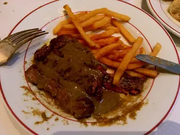 呢間餐廳想來好耐了,可惜未有機會,剛好同女友灣仔食飯,就想到上來,比起剛開店時既情況,依家無甘多人,晚上七點鐘到左都唔洗等位,呢到環境好好,被安排坐窗邊位,可以安心談心。食物呢到得一個牛扒餐,包法包,合桃沙律菜同牛扒。法包兩個人有六件,配上牛油好好食,可惜量太多,最後食唔囇。沙律配上合桃同沙律醋,好味好開胃。主菜牛扒要左medium, 有肉汁,份量不少,配上個個岀名既香草汁真係一流,另外配上既薯條都好好味,調味剛好,不過比較熱氣,可配上香草汁食,都好好味。我地都無叫到飲品,女侍應主動俾水我地,仲不時加水,服務好好。最後叫左cream brûlée 做甜品作結,甜品menu 唔識叫,好在侍應俾多張有相既menu 我地選,加分。食左兩個多鐘,就算食完野傾計時,侍應都不時加水,傾計好好,雖然價錢唔平,不過下次會再黎。…查看更多