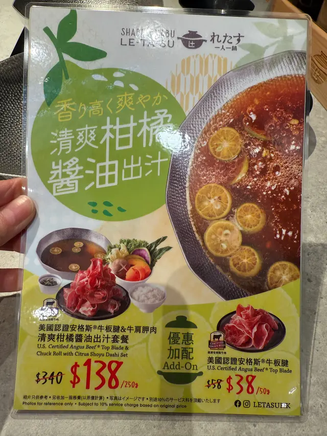 這間來自日本東京的人氣一人火鍋品牌—LETASU登陸香港,分店愈開愈多已經擴充到四間,沙田、銅鑼灣及元朗,第四間位於九龍Elements圓方,主打性價比極高的一人火鍋。店內裝潢沿用日本東京本店的和風美學概念,裝潢以和風木材為主,特別與本地公司「Plant Plant」合作組成「特色植物打卡牆」,是必影相的打卡點!清爽柑橘醬油出汁套餐(250g) - 優惠價$138 (原價$340)全新湯底以柑橘醬油為基底,再加入四季橘果香的清爽柑橘醬油出汁,酸甜平衡且果香馥郁,輕盈清新又健康無負擔,交織出細膩清爽感;美國認證安格斯牛板腱結實又不失彈性,牛肉風味濃郁且肉汁豐富,還有牛肩胛肉。特選壽喜燒套餐(200g)- $188特選壽喜燒湯底有著經典的濃郁鮮甜,層次又豐富,帶有輕微醬香,能突出食材本身的鮮味,風味濃郁,推介!每款套餐均包括野菜盛合五彩繽紛的新鮮蔬菜鮮嫩翠綠,平衡肉膩感。涼拌芝麻菠菜 & 主食(白飯)脆嫩多汁的菠菜,有濃醇的芝麻醬香氣。日本乳酪味軟雪糕 - 優惠價$15 (原價$20)絲滑無顆粒的軟雪糕酸甜平衡,酸甜乳酪融合濃郁牛奶香氣,清爽不膩且冰涼滋味。…查看更多