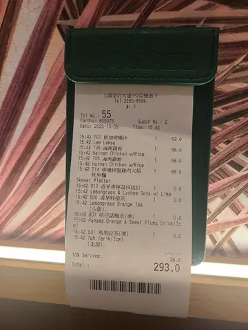 餐廳:LeeLaksa地點:上環皇后大道中菜式:新加坡馬拉菜式餐牌:茶餐14選一,有多款飯粉麵,仲有多士同沙律小食,配冷熱飲品8選一。另收加一。星期日下午茶時間由三點半開始。新加坡喇沙 $62 另加一新加坡喇沙有去殼蝦兩隻開邊,炸魚蛋3粒,彈牙炸魚蛋絲幾條,吸汁豆卜4件,半隻糖心蛋,好多爽口芽菜,通菜同紫洋蔥,面頭灑上脆脆,材料豐富。個喇沙湯好香滑,辣度剛好,梛汁又夠,好惹味。白色麵條滑溜煙韌都吸湯,唔錯。另上青桔一粒同參峇醬比你自己調味。海南雞飯 $68 另加一海南雞有十幾件,有雞脾,雞胸同雞翼,肉質好嫩滑,雞皮有彈性,點甜豉油最好食,另外仲有辣醬同薑蓉。配多條爽口青瓜。油飯好香,暖暖地上枱,都大大碗。跟有一碗冬瓜湯,飲落鹹鹹哋,好濃雞味,仲有一舊冬瓜食。串燒拼盤 $68 另加一串燒拼盤有雞肉同大蝦各3串,擺盤唔錯。串燒熱辣辣燒起,蝦已去殼,肉質好爽脆,連蝦殼都勁脆。雞肉串好多肉食,咖哩味濃,係香辣黃咖哩味,外皮整得少少脆。辣醬另上,點埋味道更惹味。伴有青瓜粒,紫洋蔥同車厘茄可以減減膩。小食都跟飲品。香茅橙茶 (跟餐)香茅橙茶有大大條香茅同大大片鮮橙,飲落係好香甜橙味,茶味唔濃,有d似果汁,叫左少甜都夠甜。香茅青檸荔枝梳打(跟餐)跟餐飲品都有幾款揀。香茅青檸荔枝梳打真係有大大枝香茅,味道完全唔甜,似梳打水,解渴得黎又唔會太肥,荔枝味道主要係底部,建議搞起先飲。凍馬來拉茶 (跟餐)馬來拉茶冷熱都得,唔洗加錢,叫左走甜。馬來拉茶飲落好滑溜,味道甜度適中,唔甜唔苦。桔仔話梅水(跟餐)桔仔話梅水有大大粒青桔同話梅,仲有好多桔皮喺底,味道甜甜地,感覺養生。總括而言,食物質素保持一貫水準,主食價錢特別抵食,星期日下午茶好旺場。…Read More