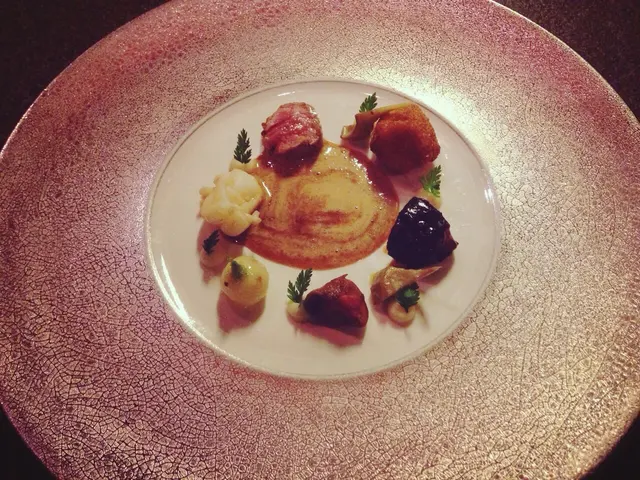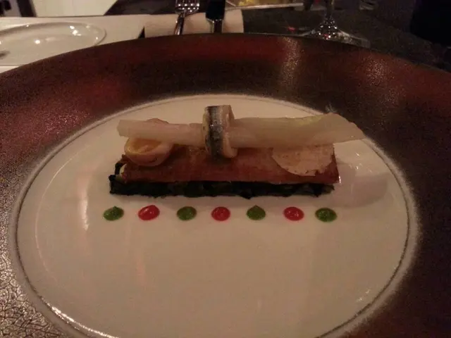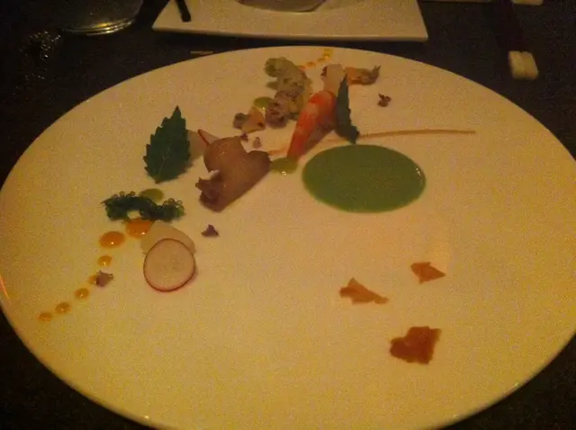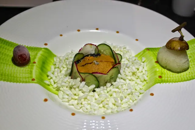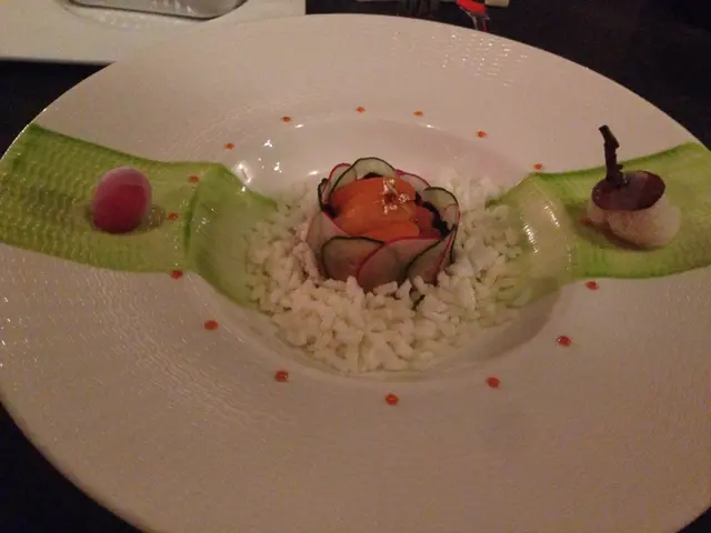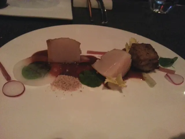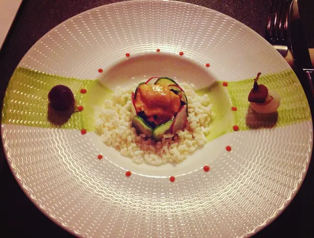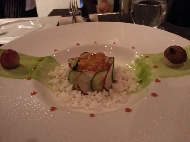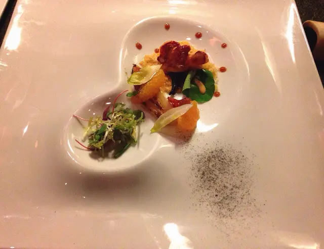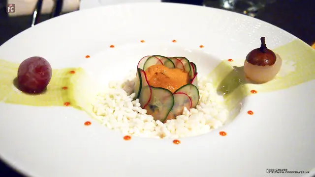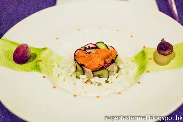 ,水o既份量剛剛好,絕對唔會滿瀉,濕巾又玩得又抹得,非常新奇有趣!美觀o既食物迅即上場,Vicky哥哥忽然轉台,以英語講解餐牌上列出o既食材是如何煮出桌上精美o既菜式,幸好座上客o既英文水評有番咁上下,大家仍能理解。第一道用碟上o既「Tuna, Sea Urchin, Espelette, Rice」係冷盤,共分開三部分,廚師建議由左邊食起。左手邊紫色o既提子粒非常冰凍,XO仔牙齒牙肉都好敏感,第一口已感寒刺骨