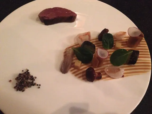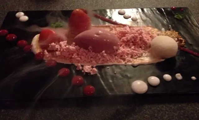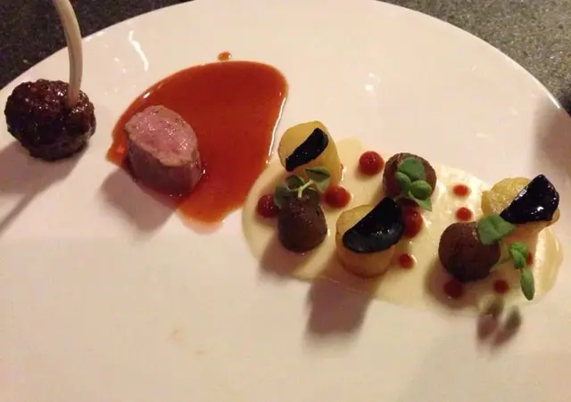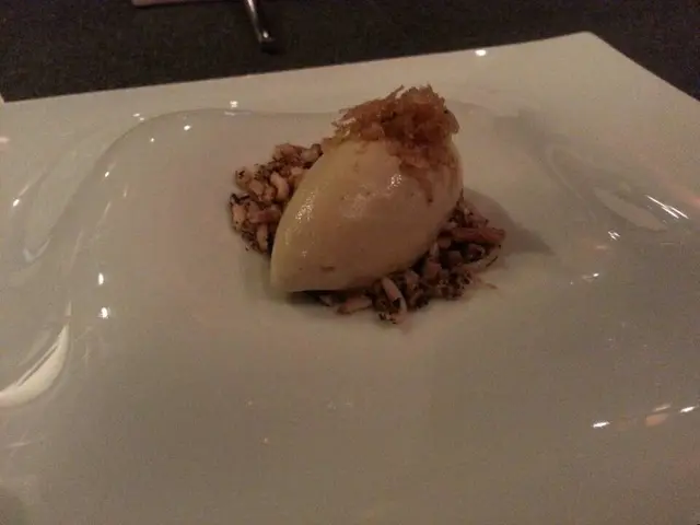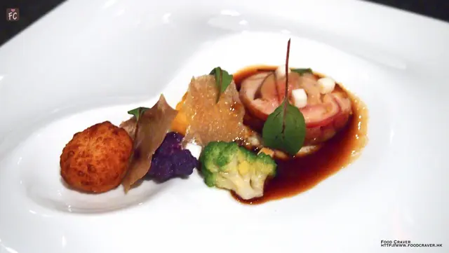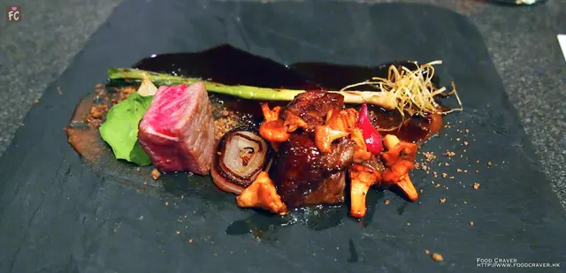 !第二道熱食「Egg, Truffle, Parmesan, Caviar」乃鎮店之寶,係餐牌上唯一唔會消失o既菜式。菜餚主角係奶白色o既芝士忌廉湯汁中o既一件松露ravioli。飽滿o既意大利雲吞原來內有乾坤,餡中有隻流心蛋黃,廚師建議食客先爆開雲吞,夾埋面層o既魚子醬、芝士及忌廉一齊食。意大利雲吞皮薄軟熟,中間o既松露流心蛋黃餡香滑幼嫩,連同頂面o既魚子醬食味道更為香濃,美中不足o既係跟和暖o既芝士忌廉湯底食效果較為溜,連續食兩道滯口菜未必個個頂得順。第三道「Chicken, Foie Gras, Porcini, Crones」終於有肉食。食材中o既雞肉來自新界,鵝肝來自法國,師傅將兩者合併煮成卷物,再以燒意大利牛肝菌菇伴碟。雞卷以去肥o既雞皮作外層,輕薄香脆,肉餡幼滑香嫩,點上碟上o既燒汁食分外甜美,小肥唯一略嫌餸菜唔夠熱。最後一道熱食為鹿肉「Venison, Gingerbread, Cherry, Pumpkin」。碟上橙色o既圈圈全為甜甜o既南瓜蓉,粉末則為粗嚡o既薑餅碎,車厘子粒頂部由蕎麥麵條造成,主角鹿肉軟嫩香濃,整碟餸最唔好味就係又韌又苦o既綠色菜葉。甜品同熱食一樣共四款,以首道「Banana, Chamomile, Coffee, Peach」最為震撼,因上枱時煙霧四散
