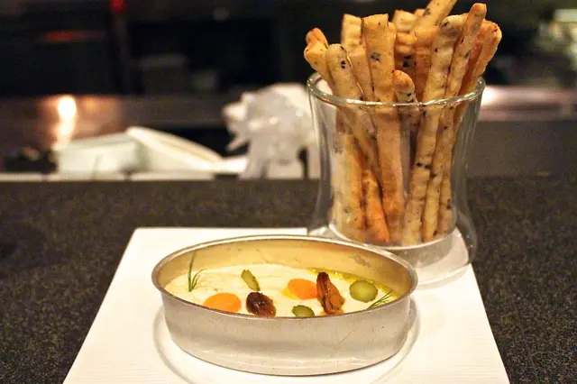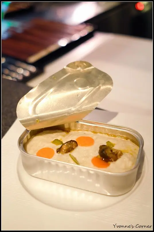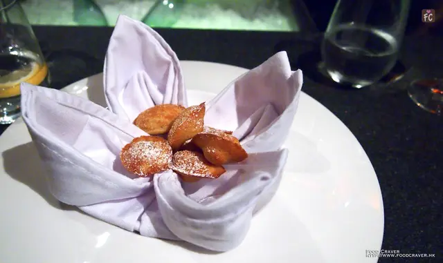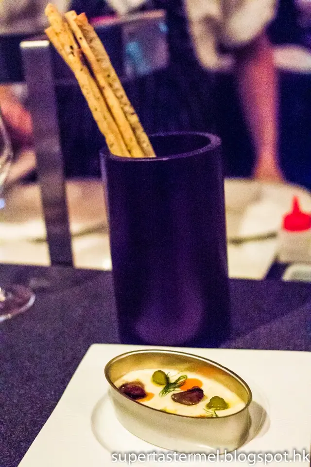 ,為何不簡單地將所有資料印在餐牌上作吧?!餐店棄選傳統o既麵包籃,而改送Grissini Breadsticks with Homemade Dip。杯中短短o既麵包條好脆口,但自家製o既海鮮醬味道頗腥,以鐡罐承載唔得高雅,女士們都食到打哂冷震