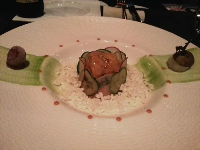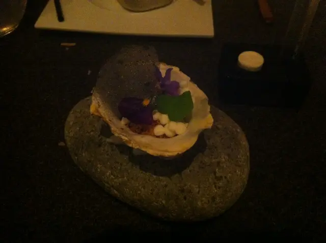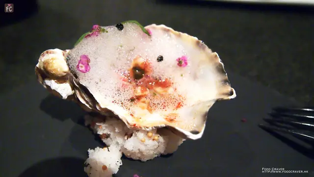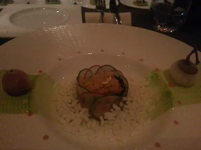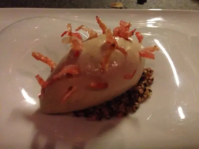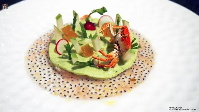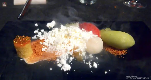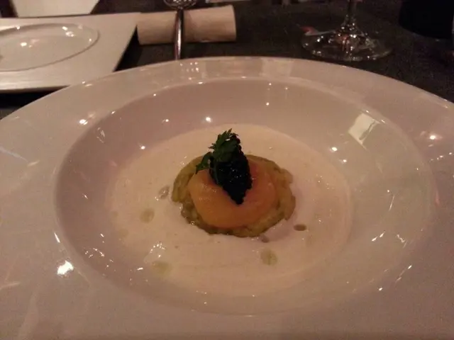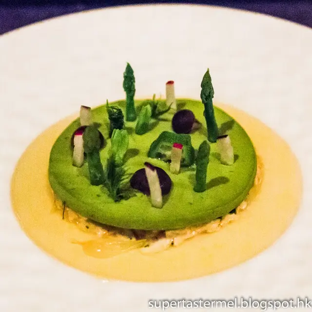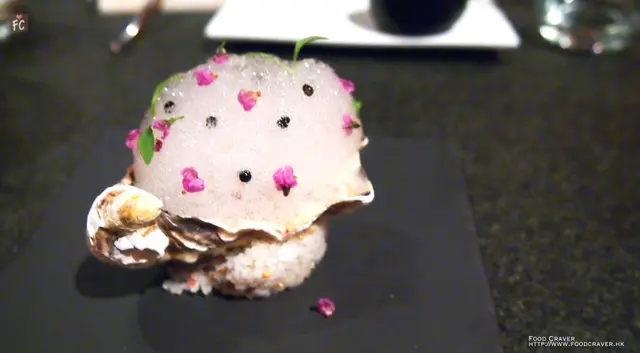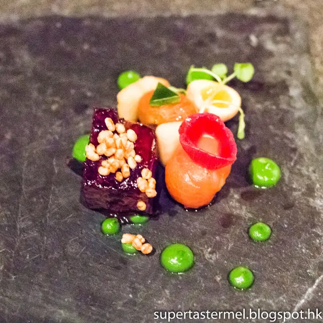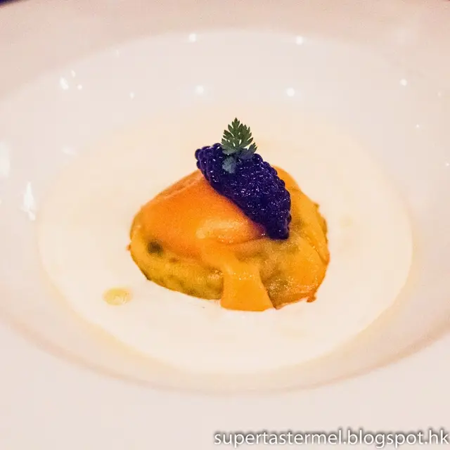 !可惜右手邊粒龍眼同左手邊粒提子一樣冰硬,兩粒生果似乎有少少劃蛇添足囉。接住落黎o既「Langoustine, Mangosteen, Salsify」同樣係冷盤,廚師先用小龍蝦頭熬煮醬汁,再用小龍蝦刺身、山竹、波羅門參及脆米片砌番個蝦形,整個構思盡顯大廚精湛o既藝術天份