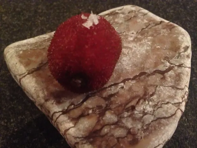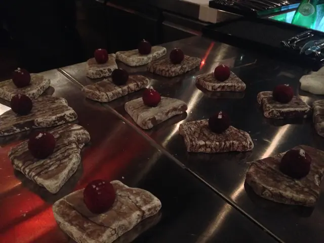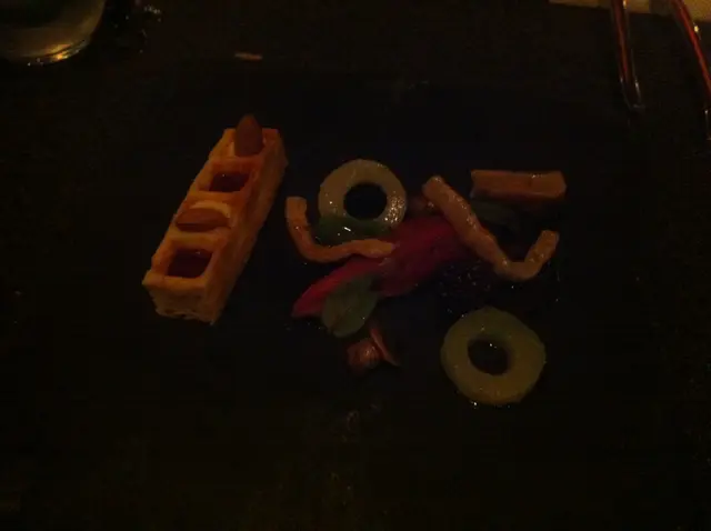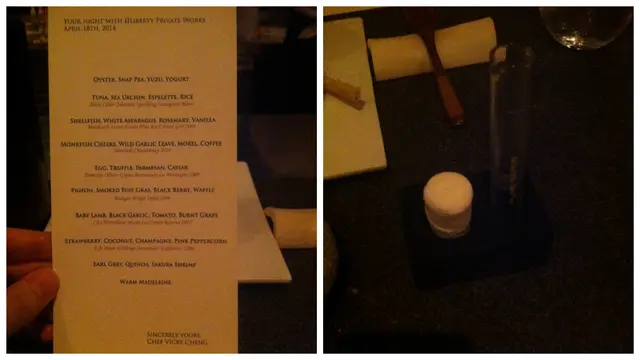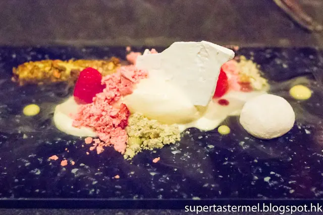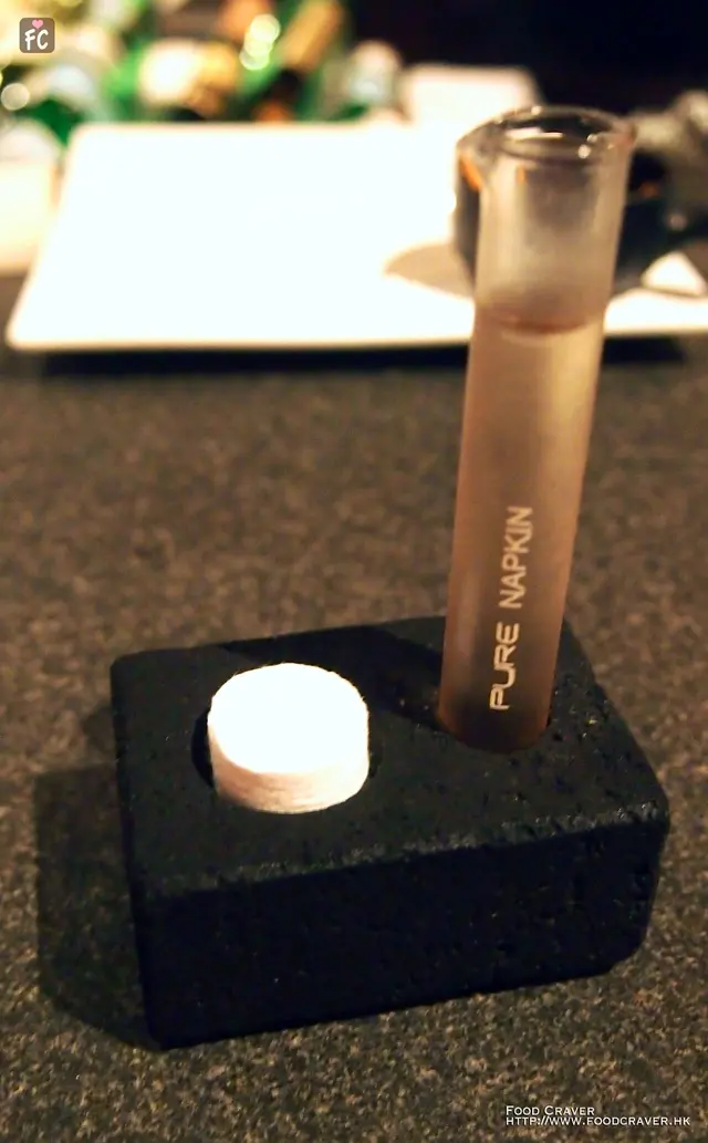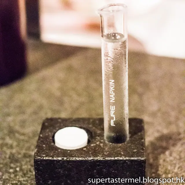 ,感覺就好似係一份Grilled Ham and Cheese Sandwich經分子料理濃縮咗o既轉體版咁。吃過小食,服務生即為客人呈上一枝試管水液及白色餅體。原來試管內透明o既液體為玫瑰水,食客只需把玫瑰露倒哂入餅體,白色o既乾紙巾餅就會變成玫瑰味濕巾