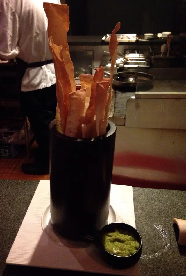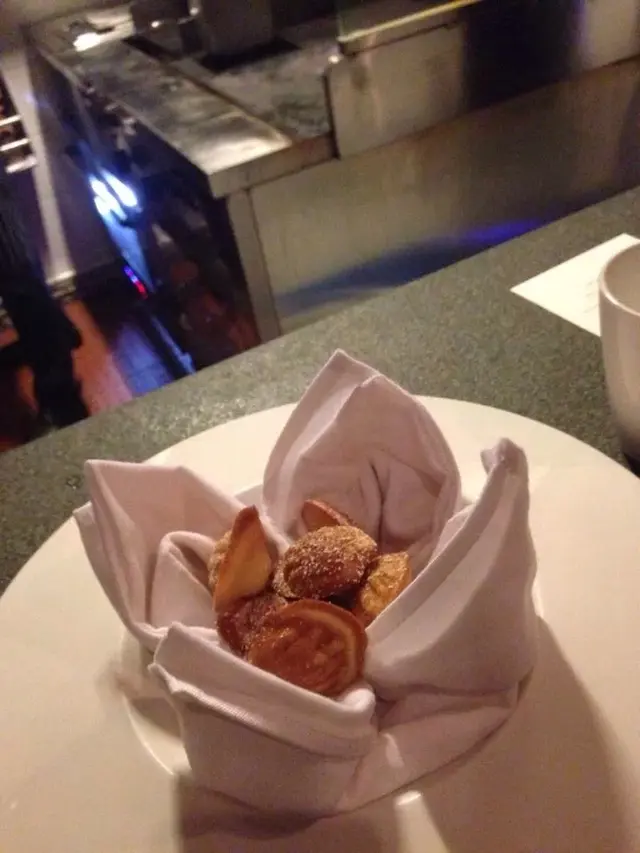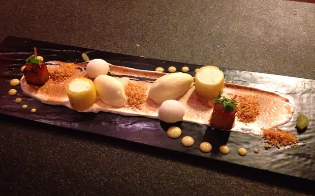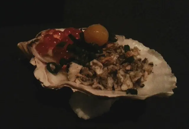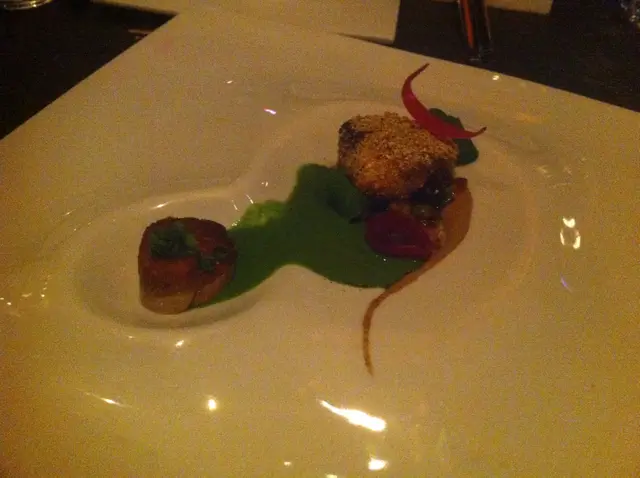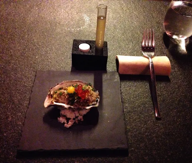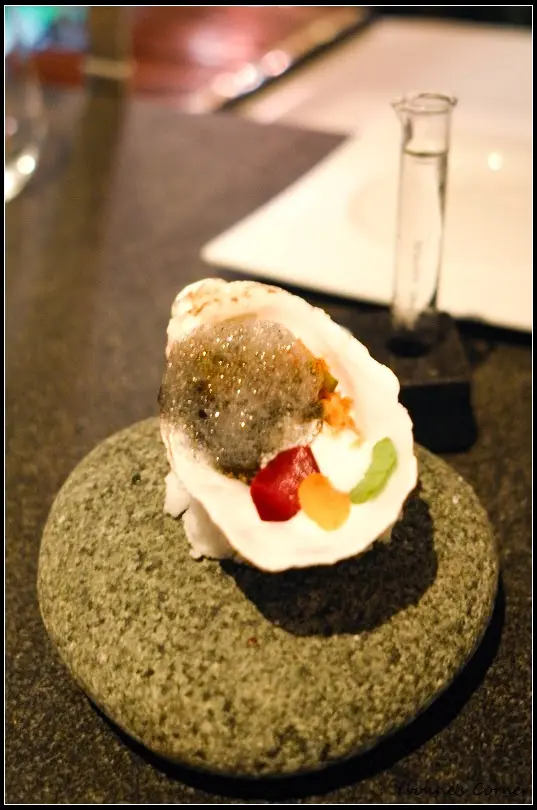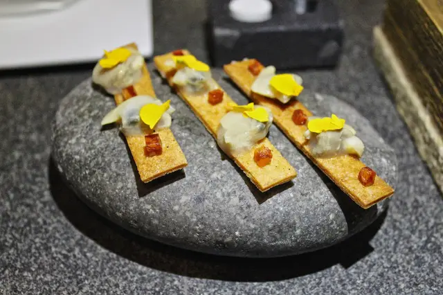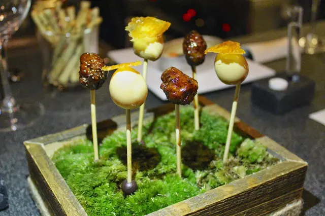 !與一眾大食會會員碰杯後餐牌上列出o既食物亦陸續上枱。首輪小食共三款,當中兩款用棒上,分別為雞皮鵪鶉蛋(Quail Egg w/ Chicken Skin)及摩洛哥羊(Moroccan Lamb),唔食羊o既食客則換上波特菇棒(Portobello Mushroom)。鵪鶉蛋棒面有塊香脆o既烘雞皮,煙燻過o既鵪鶉蛋經醋同蘋果汁醃製,食落一啲都唔溜,好有驚喜。相反地,黑墨墨o既羊棒不但外表唔吸引,其少辣o既調味令羶味更為濃烈