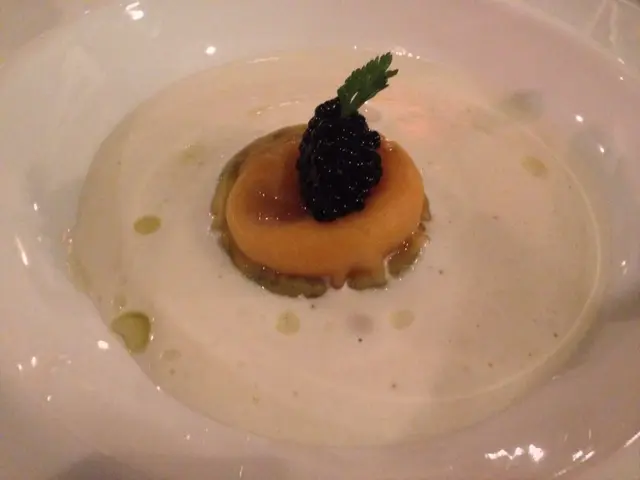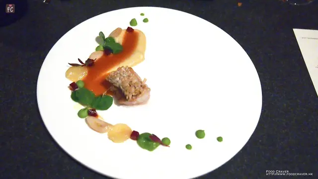 「Walu, Hearts of Palm, Celery, Apple」。餐廳選用天然肥美o既夏威夷walu魚,簡單以蘋果、芹菜及鹽烹煮。個人覺得魚塊外表香脆,外側o既魚肉偏嚡,而且味道欠奉,越食越溜滯,加上紅蘋果片超咸,芹菜汁個味道好重青草味,怪得黎極唔啱小肥口味