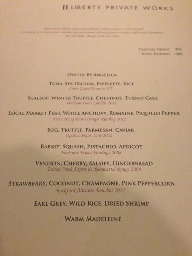 大食會初組成,XO仔就襯各會員o既冒險精神仍然高企時,揀選咗一家出名「好睇」o既新派西餐廳「Liberty Private Works」,一同體驗吓年青一代o既廚藝概念及創作。餐店只接受網上訂座,食客必先提供信用卡資料作留位之用。餐單雖然冇得揀,但訂座時可列出所有食物敏感項目,廚師會於用餐當日因應而作出調整