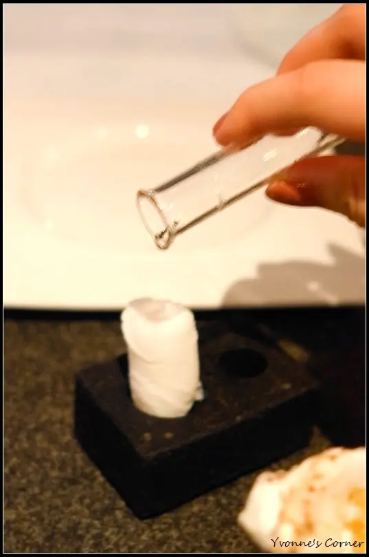 !正當大家都以為晚餐已終結時,師傅仔又再一次派上一枝試管水液及白色餅體。好自然地各人都誤以為又係之前o既濕紙巾把戲,但原來白色嗰件係棉花糖,試管內o既係荔枝水。棉花糖超甜,而且好粉,荔枝露飲落好似糖水咁,故此只能稱得上為概念及視覺上o既好結尾