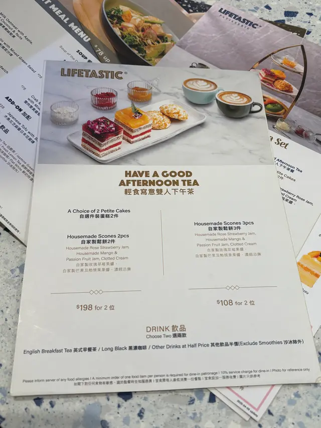 下午茶時段剛剛走過Lifetastic 被彩色繽紛的蛋糕吸引了,正在猶豫之際已有店員迎上。選了輕食寫意雙人下午茶,包括兩件自選蛋糕及兩件鬆餅,兩個飲品。「招牌草莓西瓜蛋糕」 美麗又清香,面層是玫瑰花瓣果凍,蛋糕,草莓,西瓜,玫瑰味忌廉和杏仁餅底,入口清新美味,餅底的微細杏仁粒粒令口感更豐富,一試可以再試。「紅桑子開心果蛋糕」頂層的糖花美得不得了,蛋糕好有層次,微酸的紅桑子又有好味的開心果蛋糕,非常出色。多選了一款「杜拜朱古力蛋糕」杜拜朱古力和開心果兩者結合,濃郁中又有開心果忌廉的香滑,海綿蛋糕細緻鬆軟,雙重口味,雙重享受。鬆餅口感蓬鬆但緊實,配上玫瑰草莓果醬、芒果熱情果果醬及clotted cream,好味。…查看更多