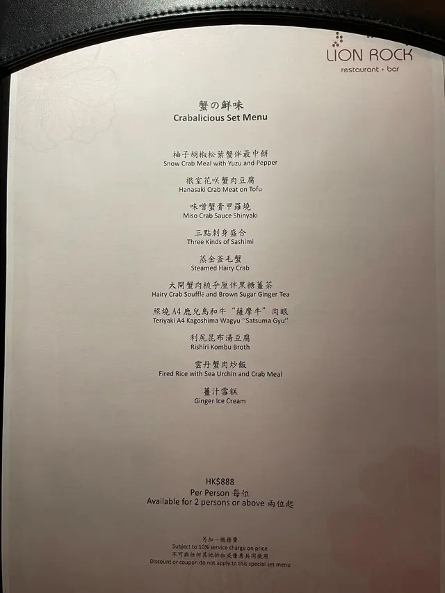 研究顯示, 不喜歡吃蟹的, 絕大部份都因為不想動手拆肉.  幸運的話, 有另一半代勞, 未有另一半的話, 有帝京酒店Lion Rock代勞, 皆因餐廳最近推出蟹之鮮味晚市套餐, 以花咲蟹、松葉蟹及大閘蟹入饌, 全程做懶人吃足10道菜!根室花咲蟹肉豆腐, 我會建議先吃一口豆腐, 以日本阿蘇山泉及及黃豆而製, 豆味香濃; 而有夢幻之蟹美譽的花咲蟹蟹肉鮮甜, 與豆腐配搭得宜, 而少少咸鮮的三文魚籽則能為整道菜點睛. 柚子胡椒松葉蟹伴最中餅, 本身已十分喜歡柚子胡椒的東西, 例如麵食, 今次以北海道三大名蟹之一的松葉蟹伴牛油果及柚子胡椒 , 口感軟滑, 好像在吃香滑濃稠的醬, 仲有黑魚子點綴, 立即升級, 可以放蟹肉在最中餅, 慢慢品嚐也很滋味. 侍應把味噌蟹膏甲羅燒端到枱前的一刻, 已經使我口水流! 有這麼誇張嗎? 有! 是晚味道最濃郁的一道菜, 蟹膏與蟹肉完美混合, 可以配爽脆青瓜或餅乾, 但我們一致認為配餅乾是最適合.   三點刺身盛合, 刺身是按當時最好的貨, 我們這份有厚切北海道帶子, 一般來說帶子都沒甚麼味道, 但經過帝京酒店師傅的巧手製作, 這件帶甜味的帶子立即俘虜我們. 油膄三文魚及赤身吞拿魚同樣新鮮, 入口軟滑.蒸北海道毛蟹, 實淨的蟹肉夠清甜, 沾蟹醋更提鮮, 會有一種離不開的感覺. 又要讚帝京酒店廚師的創意! 把四兩半重大閘蟹拆出蟹肉及蟹膏, 蟹膏加入蛋黃及蛋白打成泡沫,  創造出大閘蟹肉梳乎厘, 輕盈綿密, 吃完大閘蟹當然要喝杯黑糖薑茶, 若果辣度強些會更好. 照燒A4鹿兒島和牛 “薩摩牛” 肉眼, 數數手指, 確實很久沒吃牛啦~ 至於原因, 熟悉我的朋友也知曉啦~ 今晚我破例了! 入口即溶, 雖然油份頗高, 但肉味及軟稔度令人難以抗拒, 越吃越想吃~利尻昆布湯豆腐, 非常清澈, 讓蔬菜的清甜在湯中盡情展現. 要點澱粉質, 雲丹蟹肉炒飯, creamy及甜甜的海膽怎會不喜愛! ? 炒飯粒粒分明, 夠乾身, 每口飯都有蟹肉.聰明的你一定想到為何甜品要是薑汁雪糕, 沒錯, 蟹屬寒涼, 因此要用薑驅寒.  薑汁辣味剛剛好, 不會嗆喉之餘帶少少甜味.蟹之鮮味晚市套餐(10道菜) 每位$888, 供應至11月30日, 要吃就要訂位啊~查看更多