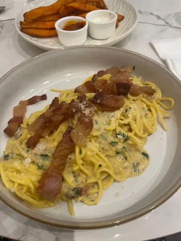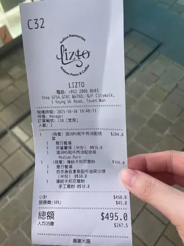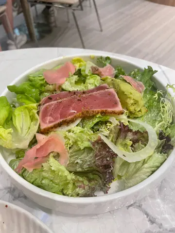 1-10-2025(Wed)朝,同老公送完回收物品,買埋餸,天氣太熱,要去商場避暑,老公話順便食埋晏。OK,去邊喥食?佢提議嚟荃新天地搵,我哋睇睇,見呢間係食西餐,就呢間啦。啱啱冇位,不過等一陣就有,坐低後,店員即講聲今日餐湯係椰菜花湯(好似),我哋睇完menu後,就決定要佢$148.00嘅千層麵午餐。5. $46.00嘅蘋果菠蘿石榴羽衣甘藍汁老公接受到羽衣甘藍嘅味道,所以叫呢個,我飲吓,飲到啲石榴味,但成杯嘢我都係接受唔到。3分3. 叫套餐正價減$15.00,變成$41.00嘅呂宋芒爆珠梳打睇見呂宋芒爆珠唔少,飲落正常唔太甜,Ok嘅。3分2 . 套餐中加$28.00嘅蒜香燒粟米配單骨雞翼menu話辣,上到枱睇,辣醬同沙律醬都分開擺 ,咁就唔驚太辣啦。先食蒜香燒粟米,um....好似唔覺有蒜香味。單骨雞翼係炸嘅,外脆內裡juicy,蘸辣醬食又唔辣喎,重甜甜地。而沙律醬就冇問題。3.5分1. 千層麵呢個都等一啲時間至到,面上有塊焗熔嘅芝士,食落,芝士有啲脆,千層麵夾住免治牛肉,成個熱騰騰,麵嘅口感都適中。3分4. 叫套餐正價減$30.00,變成加$48.00嘅Tiramisu呢個味道同口感都正常冇乜問題。3分服務:大致上冇乜問題,有禮貌,不過我落單時揀Tiramisu後,但竟然冇照做,上完嘢飲就即上,我即話後上。我哋好似食咗60分鐘,佢哋會拎張menu嚟問有冇加單,其實係暗示用餐時間就快夠。有禮貌其他:繁忙時間用餐時間限75分鐘。呢喥設每位最低消費,每位要叫一個正價產品。抵食係2.5分…查看更多