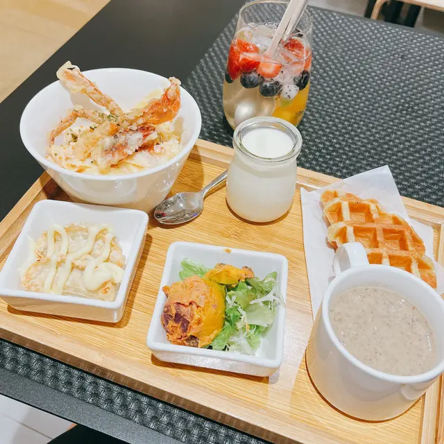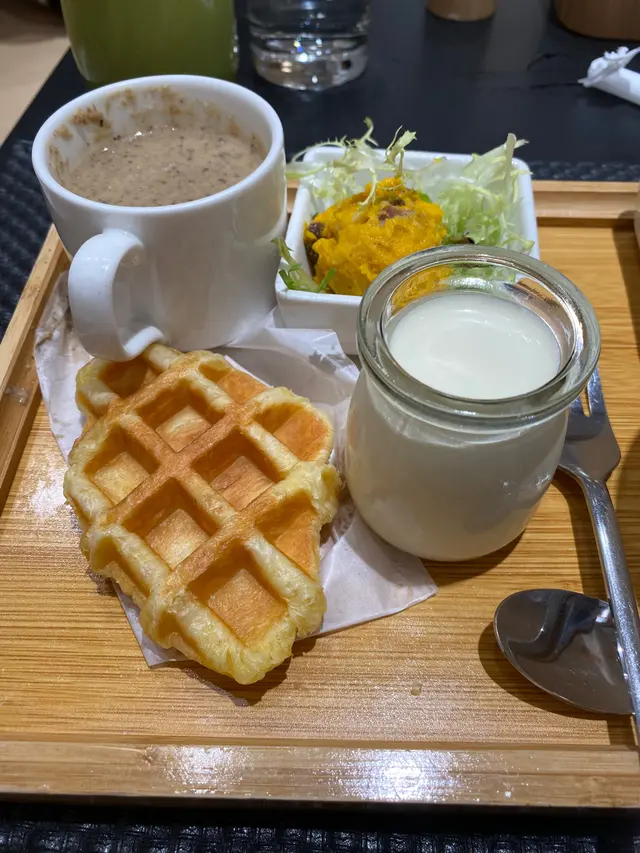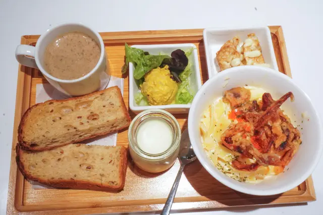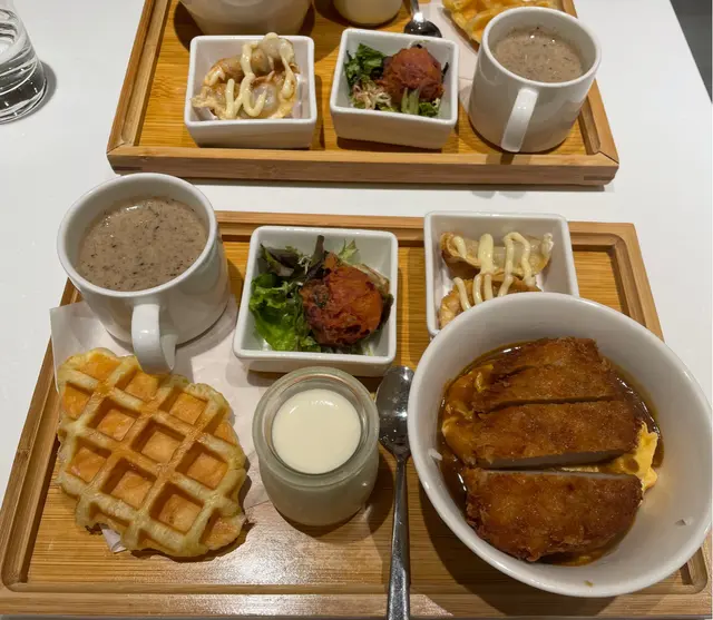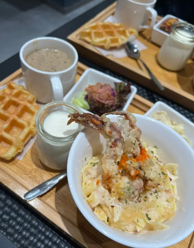 最近log on cafe翻新左,兼且同藝術家合作將藝術觀賞融入餐飲,於是去試下餐廳環境明亮簡潔,放左好多色彩鮮豔嘅工筆畫,係充滿藝術氣息下食lunch都幾有feel叫左個set, 有個蘑菇濃湯,南瓜沙律,croffle,日式炸餃子,軟殼蟹意粉,同埋牛奶布丁。我另外再叫左杯matcha latte,結果份量太多食唔晒。先講個湯,佢係用好多蘑菇打磨而成,菇味濃郁而且口感豐富南瓜沙律係個set最清新嘅食物,食材配搭都幾好croffle係citysuper little mermaid嘅出品,好香牛油味,不過有dd韌炸餃子就太多蛋黃醬lu,同埋如果係煎嘅會更好,呢個價錢唔expect會係呢個質素個軟殻蟹意粉就真係幾好食,好creamy牛奶布丁都幾香甜奶滑,不過個人口味比較鍾意冇咁水嘅布丁最後要推介下個matcha latte,好似milkshake 咁,好濃厚嘅味道!整體上都幾好食,係貴左少少,但份量多,可以兩個人分另外要讚下d畫好高質,睇到畫家細膩豐富嘅畫風,不過個bgm就唔係太夾成個experience la, 建議細聲少少…查看更多