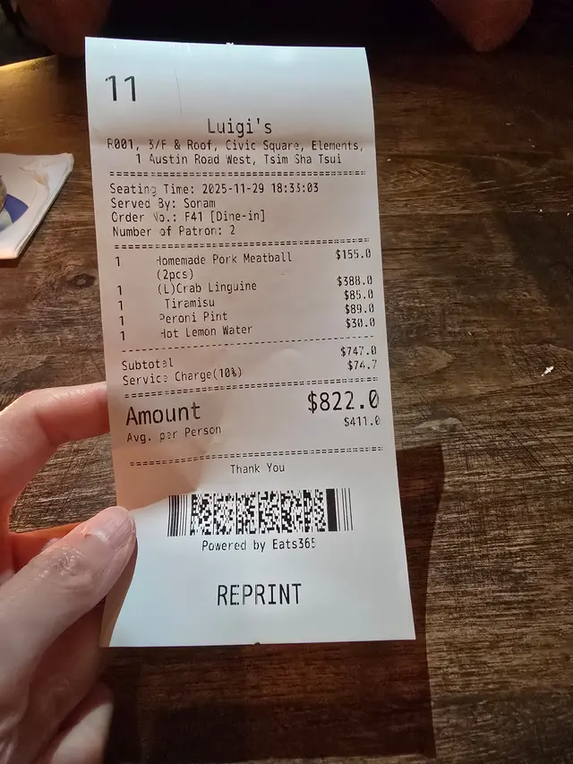 圓方頂樓個排餐廳全部裝修都好high class而且每間都係做唔同國家嘅菜式,但係其中最full house係Luigi’s🙌🏻餐廳會為 8歲或以下小朋友提供免費食物,所以好多family都會選擇係到用餐呢度最大特色係pasta可以揀large portion大約2人份量,今次試左fusion蟹肉姜蔥扁意粉口感非常al dente蟹肉份量慷慨,不過整體偏咸左少少🤏🏻至於前菜水牛城雞翼辣味好足,啱晒無辣不歡人士甜品係mvp即叫即焗嘅brownie🍫除咗朱古力味好濃郁之外重點在於中間仲keep到流心😭🤌🏻加埋雪糕食係冇得輸!餐廳仲有好多款mocktail選擇,其中Virgin Colada係沙冰口感,椰子味好重,推薦🙌🏻-𝘼 𝙇𝙖 𝘾𝙖𝙧𝙩𝙚 𝙈𝙚𝙣𝙪𝗕𝘂𝗳𝗳𝗮𝗹𝗼 𝗪𝗶𝗻𝗴𝘀 $𝟭𝟰𝟱 ⭑⭑⭑⭒⭒𝗖𝗿𝗮𝗯 𝗟𝗶𝗻𝗴𝘂𝗶𝗻𝗲 (𝗦𝗵𝗮𝗿𝗶𝗻𝗴) $𝟯𝟴𝟴 ⭑⭑⭑⭑⭒𝗕𝗿𝗼𝘄𝗻𝗶𝗲 $𝟭𝟭𝟬 ⭑⭑⭑⭑⭒𝗩𝗶𝗿𝗴𝗶𝗻 𝗖𝗼𝗹𝗮𝗱𝗮 $𝟳𝟵 ⭑⭑⭑⭑⭒𝗣𝗮𝘀𝘀𝗶𝗼𝗻 𝗦𝗽𝗮𝗿𝗸𝗹𝗲𝗿 $𝟳𝟵 ⭑⭑⭑⭑⭒…查看更多