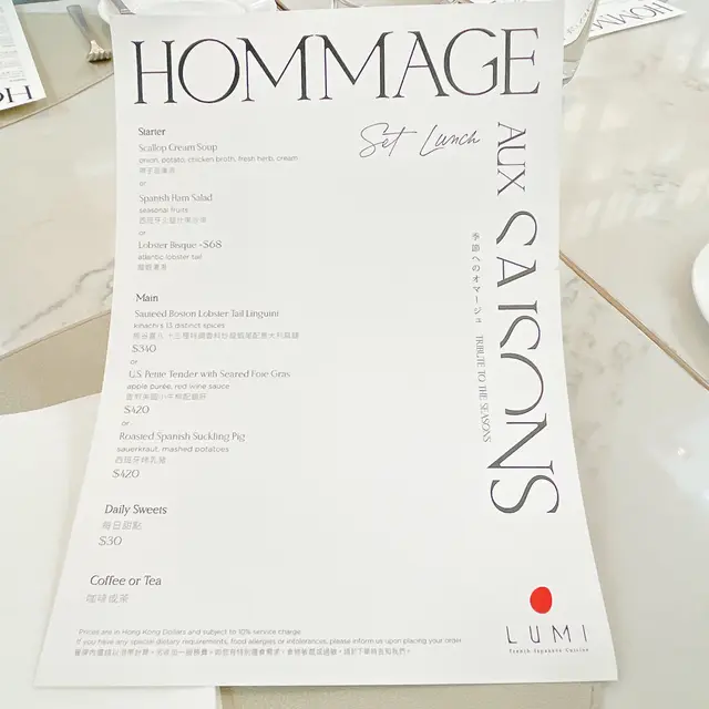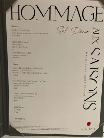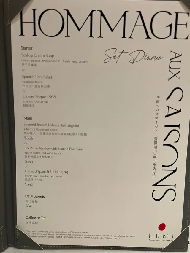 主打法日菜式, 由日本名廚熊谷喜八自創; 精選環球時令食材, 配上法國菜烹調技巧, LUMI 旨在將繁複的法國菜轉化為日常美饌。