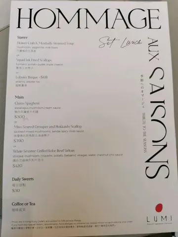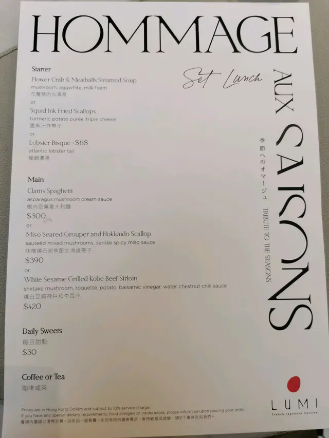 之前沒有特別留意到,原來LUMI是一間French-Japanese餐廳,只知這裡有兩樣比較吸引我的地方:1) 總是覺得他們的出品有一份額外的細致;2) 在高級商場以開放式佈局設置。出品的細致,當知道該餐廳原來有日式元素,那便明白了,因為我感到的那一份額外的細致,跟傳統法餐或西餐是有所不同的。至於開放式佈局,可能是由於位處商場中間位置,本身租戶只能以開放式佈局為setting (這純粹是我的猜測,因為這位置的前身都是同樣的佈局)。感覺上,理應缺乏了私密感,任何人行過都會見到你,但我更喜歡那份開揚而不局促,室內的舒適帶著戶外的空間感,又由於位處商場寬敞的位置而不會太嘈雜,午餐、下午茶,這是一個頗不錯的地方。食物方面,我點的花蟹豬肉丸清湯鮮甜清澈,比起來來去去飲過無數次的忌廉湯、羅宋湯或洋蔥湯,這是一個很清新的選擇。我們三個人午飯,set lunch的三個主菜選擇我們全點了:蜆肉忌廉意大利麵($300)味噌燒石斑魚配北海道帶子($390)燒白芝麻神戶和牛西冷($420)質素、地點、環境三樣總括,我認為是一個合理而不錯的選擇。值得一提:餐前麵包相當不錯,我吃了兩塊還想encore呢!