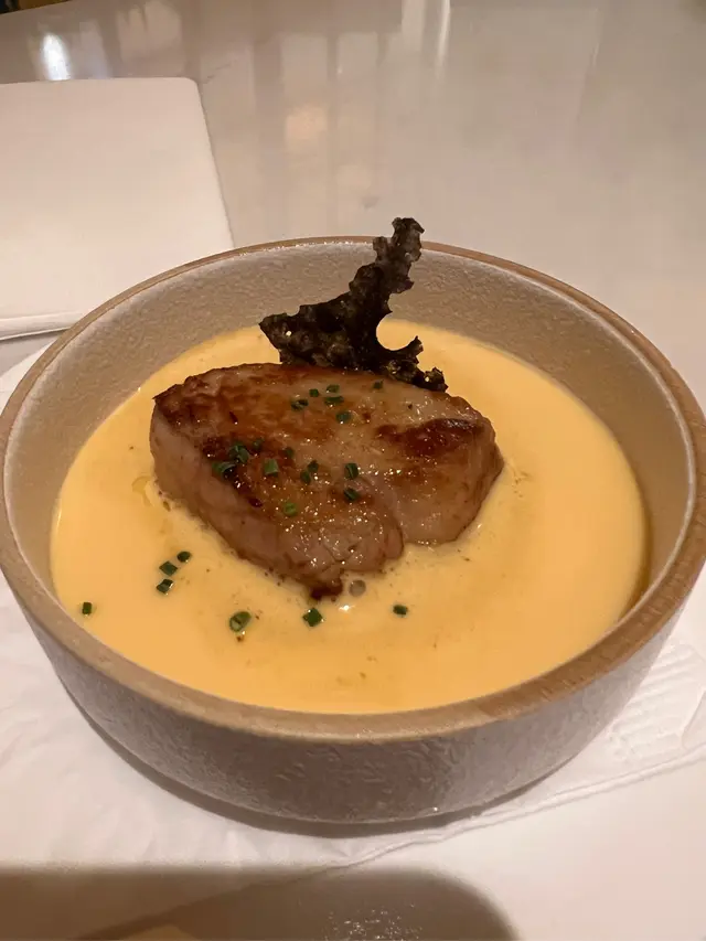 再次光顧這間餐廳🍴,看見晚餐吸引🤩,就再次嚟食個晚飯🍽️。 不過,今次份量好似少咗好多🤔,唔多夠飽😔🍽️ Order 咗2 set 🍽️ 五道菜晚餐包括:🦞龍蝦柚子啫喱🍮 ~ 賣相靚,龍蝦🦞肉大大件,又爽口,好開胃日式鵝肝茶碗蒸🥣 ~ 熱騰騰,勁好食,鵝肝無怪味🤪,不錯😌🥩香草烤美國小牛柳🍝香煎紅蝦配北海道海膽意大利扁麵 ~ 份量太少😕,不過,味道不錯👍🏻雪葩配熱情果凍🍨🧆 咖啡或茶🥤☕️,餐前有個小牛角酥🥐,好鬆脆另加$88享用🦞龍蝦濃湯一客 ~ 真係好濃郁,龍蝦🦞啖啖肉,好爽口😋我哋額外加多咗一份🐷巴黎式北海道豬扒,係厚切豬扒啊,味道一流,肉質嫩,比想像中好食😋整體而言,食物嘅賣相,味道都一流,服務態度不錯,環境又舒服🛋️🌹🌷🌺🌸,所以今次已經係第二次嚟晚餐🤗,都係坐半月形梳化🛋️,後面就係好大束花🌹🌷💐🌸,影相📸️好靚,背景好鮮艷🌈.