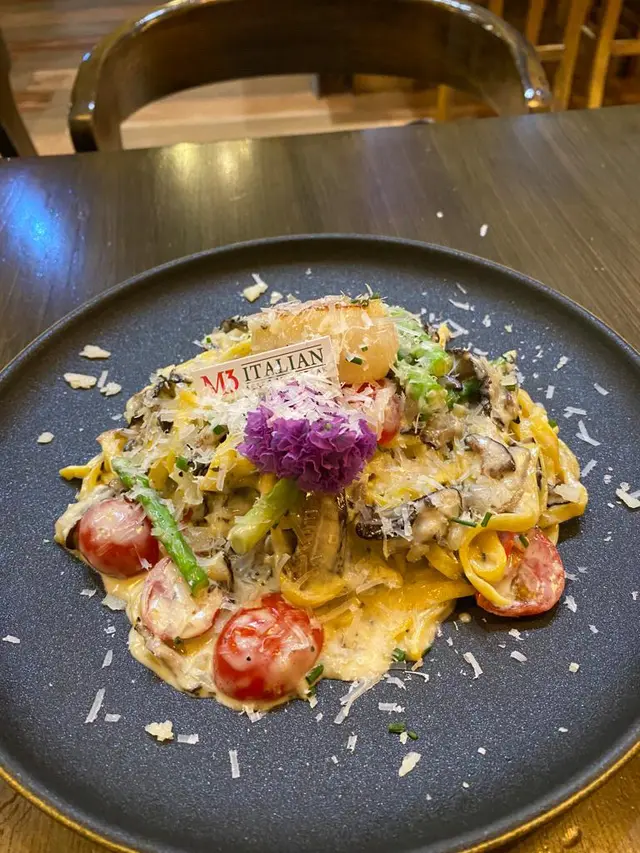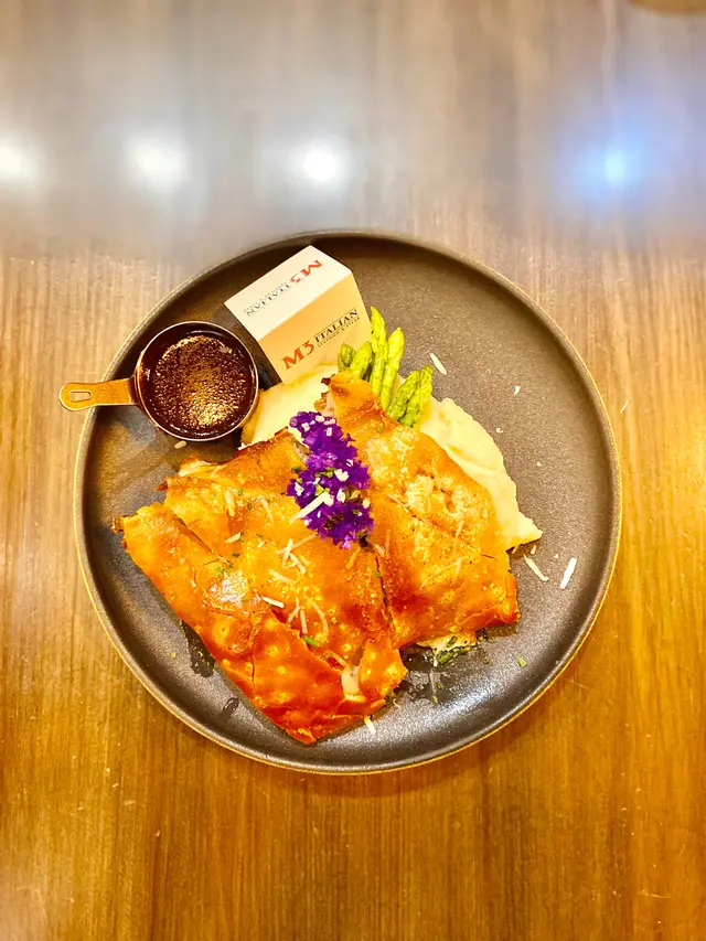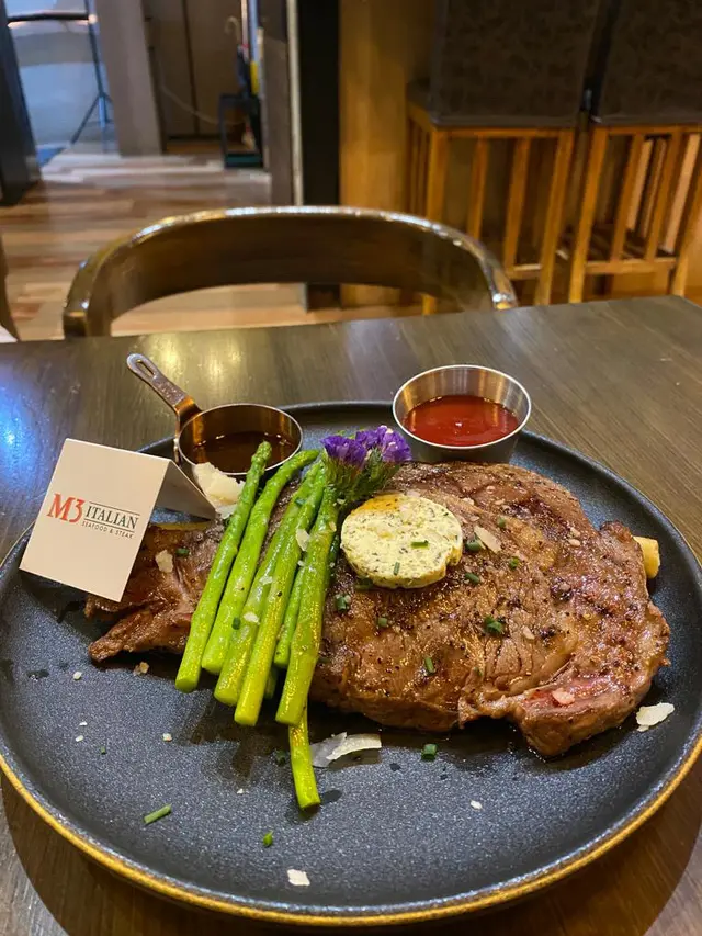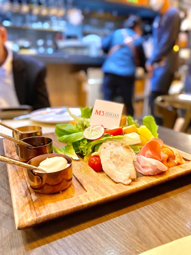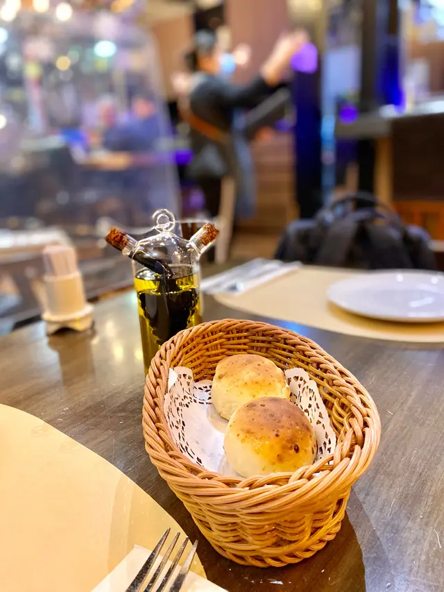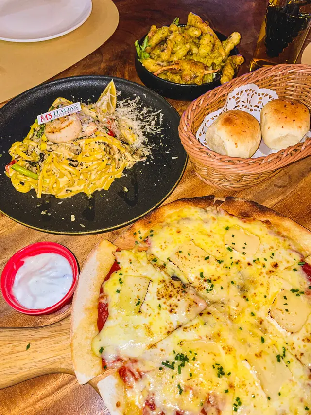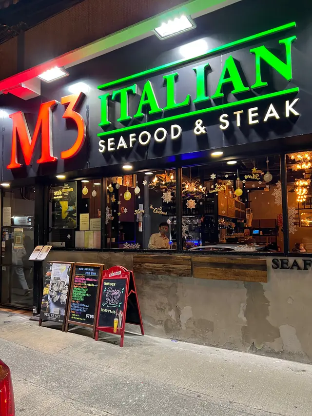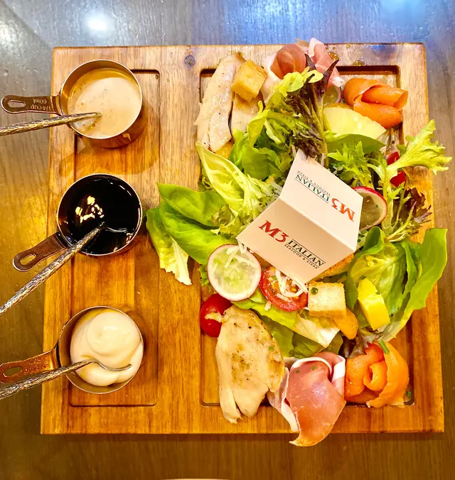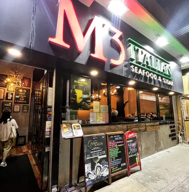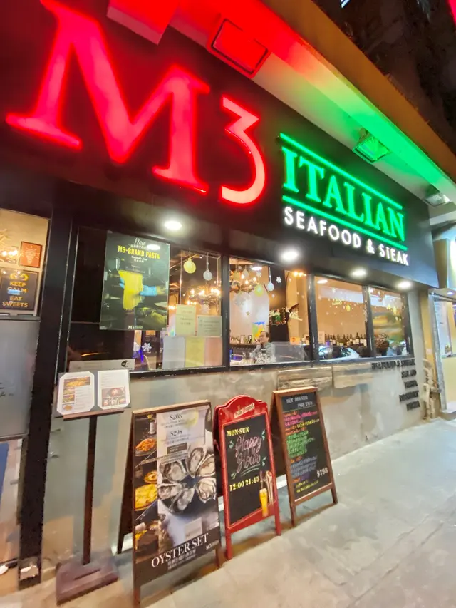 有日去大圍揾朋友食晚飯,揾到呢間食意大利既餐廳叫「M3 Italian」。🇮🇹💕🤓😊兩個人點咗以下餐點……餐前小吃:🥖麵包配油醋汁上枱時仲暖暖哋,食落口感鬆軟,配上油醋汁,好味。😋1️⃣M3 沙律🥗$168食材包括烤雞🐔、煙三文魚🍣、巴馬火腿🥓、大量沙律菜🥗,配上三款醬汁,分別有沙律醬、芝麻醬、黑醋汁,份量十足,食材新鮮。👍🏻2️⃣炭燒美國肉眼扒🥩$328揀咗五成熟,肉質淋滑,配上爽脆蘆筍,香脆粗薯條🍟,濃郁燒汁,好惹味。😋3️⃣意大利四色芝士手製薄餅🧀🍅🍕$178超濃郁芝士味,芝士迷必點,大愛手製薄脆餅底,加上新鮮蕃茄醬,好醒胃,好正。👍🏻下次想品嚐一下佢哋嘅西班牙燒乳豬、黑松露意粉!😋💕…查看更多