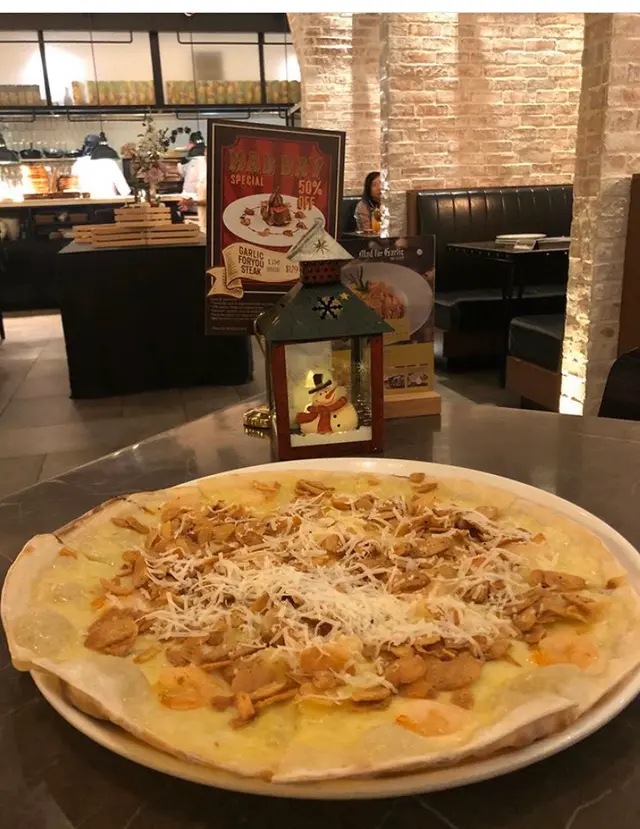 呢間餐廳特別之處係所有菜式都選用左蒜頭為主題🥴🥴🥴🥴如果係喜愛蒜頭嘅人會或者會鍾意,小編本身都係一個蒜頭喜愛者,但係食完今餐之後,感覺口乾,應該落咗好多味精,你話如果味道嘅話我覺得還可以,不過過於味精重,所以本人唔太推薦呢間餐廳,唯一嘅優點係依間餐廳嘅裝修精緻,座位寬敞舒適,可以適合三五知己嚟聚餐。主要今次叫咗牛扒Garlic hug steak ,蒜頭味pizza,雞排 Risotto,Garlic Sizzling rice . 唯一比較推薦嘅係garlic hug steak, 其他菜式相對之下比較油膩。