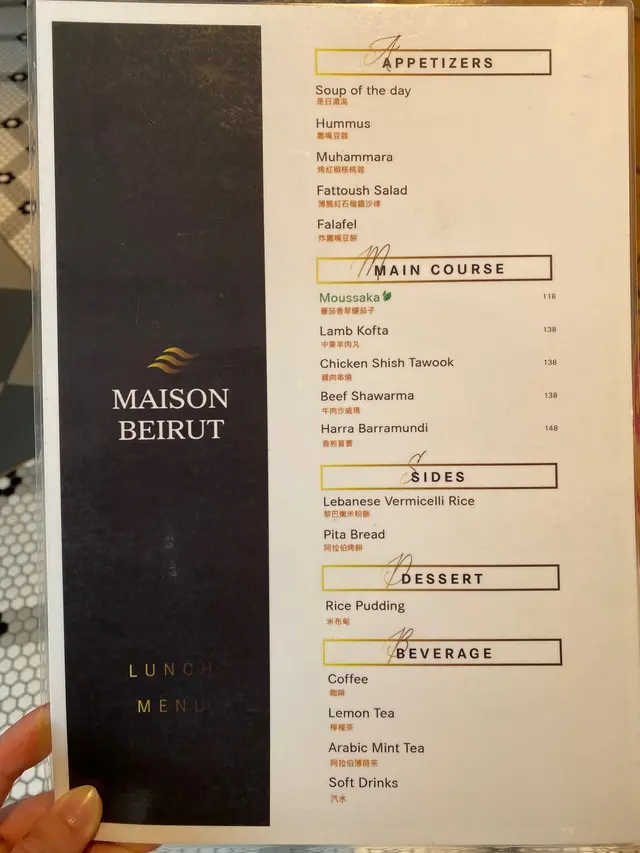 Maison Beirut (將軍澳) 網上訂座即賺Rice Dollars 網址: https://s.openrice.com/QrbS0AVmC00 地址: 香港將軍澳唐賢街29號藍塘傲格林威治村地下10號舖 電話: +852 23210368
