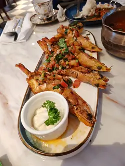 首先,視覺上高度享受,海邊晚宴,對着中東風的鍍金邊餐具,已經覺得置身海外。食物也比想像中對東方人胃口,當日已經第一時間通知將軍澳的朋友,叫他們來試試這間富有特色的黎巴嫩菜。一定要吃他們的羊肉汁配飯,這是外面的一般餐廳沒有的。它的湯汁是酸辣的,非常開胃,而且份量很足。它們烤蝦也很好吃。這道酸辣酸辣的,配上生鮮的海鮮,真的非常好吃。那天是星期五,我遇上了他們的特別節目- 肚皮舞。雖然我不懂欣賞,但作為餐廳特色,我覺得十分有趣可惜因為颱風令店舖要關店整修,真心希望可以早日重開。