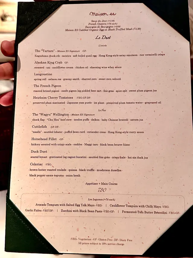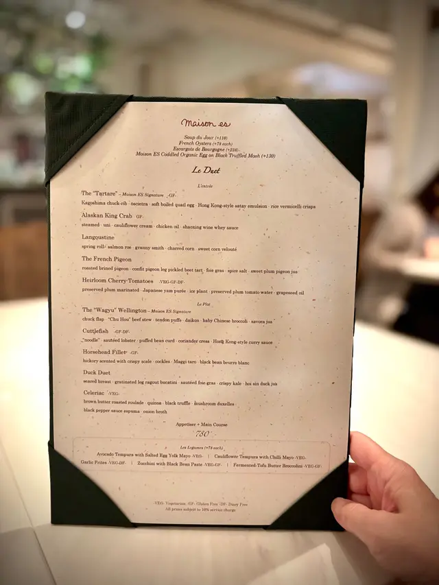 灣仔區以復古花園風design嘅Maison ES Signature Elite 4 course (HK dining week)晚市套餐($580/位).⸝꒰ 1 ˢᵀ course ꒱ 烤熟成墨魚三文魚子。蘿蔔。青瓜。水菜。香辣芝麻醬製作熟成墨魚香軟又充滿彈性 配上三文魚子更鮮味底下芝麻醬再配搭鎮江香醋&生椒油令味道充滿層次꒰ 2 ᴺᴰ course ꒱ 番茄他他將新鮮蕃茄製成他他 配上枝豆及山楂啫喱味道相對清爽開胃 可以清新一下口腔去迎接主菜꒰ Main ꒱香烤鴿肉•備長炭烤油甘魚鴿肉以鹽水處理後再烤香 切開鴿肉粉嫩又充滿肉汁 帶住微微香甜感 配上香茅南薑法羅麥 煙煙韌韌帶點堅果香油甘魚充滿豐腴魚油甘香及淡淡炭香 配搭檸檬白酒牛油汁更突顯鮮味 旁邊仲配上魚子醬&蘆筍꒰ Side ꒱ 大蒜法式薯條•豆豉炒意大利黃瓜蛋黃醬加入炸蒜粒 更香更惹味用上中式豆豉配搭意大利黃瓜估唔到又幾夾꒰ Dessert ꒱芒果芝士蛋糕慕絲整道甜品好輕盈 芒果蓉充滿果肉又甜最後亦送上充滿檸檬香嘅馬卡龍…Read More
