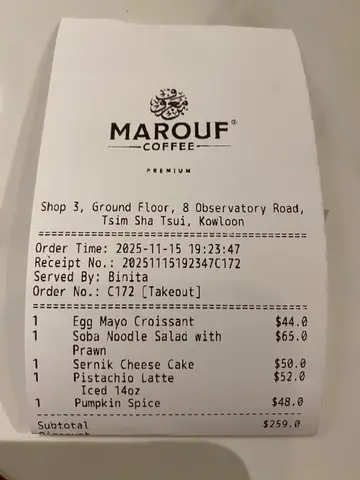 # ☕【Marouf Coffee 尖沙咀】中東風味注入嘅靜心角落 上星期同老婆夜晚行尖沙咀,無計劃咁行到天文台道,見到呢間 **Marouf Coffee**。門口設計乾淨簡約,金光字體加黑色裝修,有啲異國風,好吸引眼球。上網一查,原來佢哋主打阿拉伯咖啡,好特別,立即入去試吓。 ---## 🌿 環境 裡面坐位唔算多,不過枱距闊落,有啲地方係落地玻璃,可以見到街景。**光線柔和,氣氛舒服,有少少高級lounge感覺。** 啱晒晚餐後chill下,又或者情侶想靜靜傾偈。 裝修簡潔但有品味,用色以黑金、木質為主,**比起一般咖啡店感覺更精緻啲。** ---## 🥐 蛋沙律牛角包 $44 牛角包一上枱已經聞到香味,外層**烘到金黃色、酥脆又帶少少牛油香**。 入面夾住份量十足嘅蛋沙律,滑滑 creamy,蛋味香濃,但唔會太膩。 中間仲有新鮮生菜,增加咗少少清爽感,**整體好平衡,好似簡單但認真嘅輕食。** 我老婆話呢個完全值得再食一次,尤其係啱啱焗完咁嘅香氣。 ---## 🍜 蕎麥麵沙律配蝦 $65 賣相好乾淨整齊,整體好似日本便利店沙律升級版。 有冷凍蕎麥麵、沙律菜、全蛋切片、蝦仁同蕃茄仔。 醬汁係少少芝麻味道,好襯蕎麥麵嘅淡香。 **蝦新鮮爽口,唔腥;麵唔黏笠,凍咗都保持彈性**。 呢個沙律食落清新,係啱晒夜晚唔想食太heavy 嘅朋友。 ---## 🍰 Sernik Cheese Cake $50 件芝士蛋糕啱啱睇就好靚,面層鋪咗三團白白嘅忌廉,外型幾特別。 食落質感**偏實身少少,唔太甜,芝士味濃但唔膩。** 底層餅皮好香脆,有牛油香,我老婆話佢最鐘意就係嗰層餅底,有咬口,唔似有啲太軟嘅芝士餅咁單調。 ---## ☕ 特飲:凍開心果鮮奶咖啡 + 熱南瓜味咖啡 ### 🧊 凍開心果鮮奶咖啡 $52 呢杯係我嘅心水之一!入口第一啖已經有啲**堅果香氣,開心果味濃郁得嚟唔苦**。咖啡味都幾重,但融得幾自然。 混合鮮奶後變得滑滑地,好似甜品同咖啡之間嘅中間點。 唔似其他café嗰啲過甜開心果latte,呢杯係**真材實料、飲得出層次感。**### ☕ 熱南瓜味咖啡(Pumpkin Spice)$48 老婆揀嘅節日限定特飲,上面一大團鮮忌廉,再灑上肉桂粉,一睇就好有秋冬氣氛。 啜一口,**咖啡香同南瓜味齊齊出,肉桂香好明顯但唔搶味。** 甜度控制得好,熱飲嘅溫度啱啱好,飲完整個人都暖晒~ ---## 💸 價錢 & 總結 兩個人一共 **$259**,以尖沙咀嚟講其實算合理。 食物用料新鮮、細節有誠意,最難得係**咖啡真係有自己風格**,唔係千篇一律嗰種。 環境舒服、唔嘈,**幾啱坐耐啲或者做吓野。** ---## 🌟 總結感想 > **Marouf Coffee** 絕對唔係一般連鎖咖啡店, > 阿拉伯風味嘅咖啡同輕食style令人印象深刻。 > 味道上有驚喜、環境又優質, > 如果你想避開人多多嘅咖啡館,靜靜坐下享受杯好咖啡,呢度真心推介。 📍 **地址**:尖沙咀天文台道8號地舖 ☕ **必試**:開心果鮮奶咖啡、蛋沙律牛角包 🍰 **甜品推介**:Sernik Cheesecake 💬 **整體評分**:9/10 – 有質有味的中東系café!…查看更多