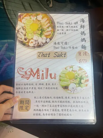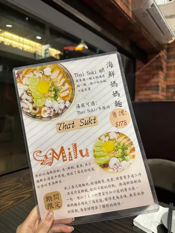 今次誤打誤撞闖入尖沙咀天星大廈4樓嘅MILU THAI,真係有驚喜!由泰籍廚師坐鎮,室內外座位都勁闊落,坐得舒服夠晒chill~重點試咗近期泰國瘋傳嘅海鮮媽媽麵($178),個賣相澎湃到呢⋯⋯鮮蝦彈牙,墨魚仔爽口唔韌,滑魚片吸盡湯底精華,最過癮係加埋泰式醃豬腩肉,鹹香帶油香,邪惡到極!湯底有SUKI同冬蔭功兩款,我揀咗SUKI版,師傅調校到甜味先行,辣味偷偷跟尾,啱晒我呢啲又想食又怕辣嘅辣界新手!如果鍾意濃烈衝擊,冬蔭功應該更啱胃口。小食拼盤($188)絕對係選擇困難症救星——蝦餅爆汁、魚餅香辣、春卷脆卜卜,香葉雞醃得入味,點埋酸辣醬汁,一秒飛返去曼谷街頭!椰汁雞湯($178)真心要讚!有大細兩個size,我哋兩個人嗌左大煲但絕對明智。椰香溫柔包裹住酸辣鋒芒,飲完成個胃暖笠笠,一口氣飲咗兩碗!蒜蓉椰菜苗($98)炒得夠鑊氣,清淡平衡返成餐濃味。飲品方面,椰青($52)清甜解膩,珍多冰($36)甜度適中,綠粉條咬落煙韌,完美收尾。MILU THAI無論環境、食材、功夫都交足功課,海鮮媽媽麵絕對係必點item,唔使飛泰國都食到地道風味,勁正!…查看更多