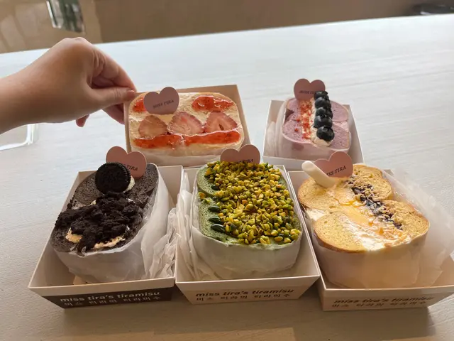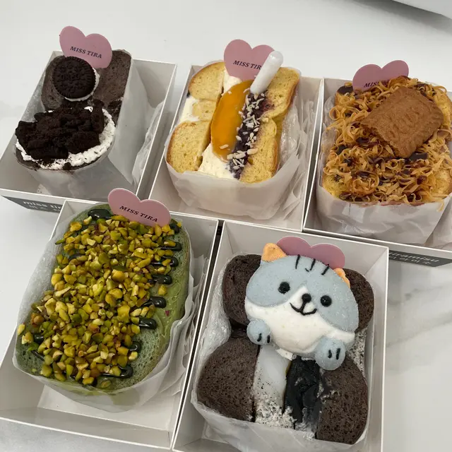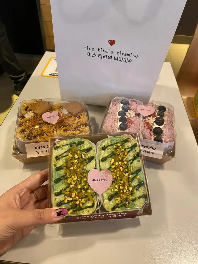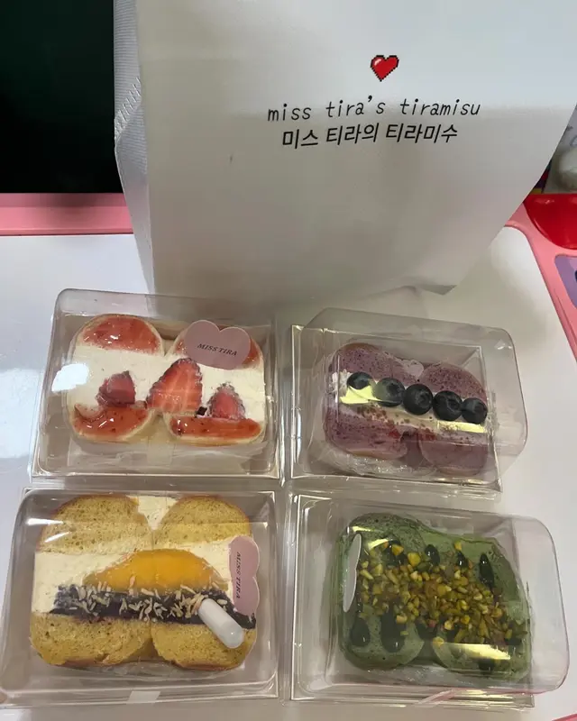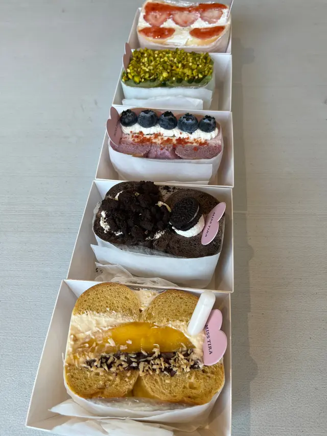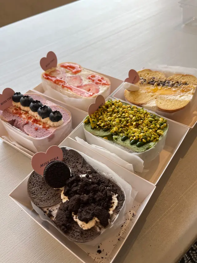 經過𝙢𝙞𝙨𝙨 𝙩𝙞𝙧𝙖 見到咁colorful忍唔住停低腳步之前一路都係得tiramisu賣今次見到有厚醬夾心貝果Bagel🥯 揀咗5款同大家分享下◡̈✧ 雙重濃厚開心果厚醬夾心貝果($38)身為一個開心果怪第一時間梗係揀一嚿開心果味先啦一打開包裝就聞到好香濃嘅開心果味啲開心果碎literally係鋪滿成個top🥹食到粒粒開心果碎而且開心果醬就好綠好幼滑真係好滿足!✧ 泰式芒果椰香紫糯米厚醬夾心貝果($28)呢個口味真係好特別🇹🇭得佢有個科學堂啲dropper仔可以適啲椰汁落bagel令椰香嘅味道好出🥥一啖咬落去首先感受到嘅係芒果嘅香甜🥭用佢做底嘅甜品永遠最穩陣事關佢陣酸甜味好幫到手~最後係煙韌嘅紫糯米 整體好有層次感✧ 藍莓厚牛乳奶凍脆脆厚醬夾心貝果($28)藍莓醬酸酸甜甜比較清新 🫐牛乳奶凍就好滑溜Bagel口感煙韌加埋脆脆就令到口感好豐富~✧ 奧利奧海鹽厚醬貝果($28)Oreo 味好濃郁 比較邪惡😈啲餅碎加埋少少海鹽奶蓋有甜中帶鹹嘅感覺真係好難抗拒keke✧ 草莓提拉米蘇厚醬貝果($32)5款入面嘅顏值擔當(•ૢ⚈͒⌄⚈͒•ૢ)粉白色系少女心滿滿💓草莓醬酸酸甜甜一路影相啲醬一路滴緊😳Cream亦都打得好滑兩者味道好夾總括嚟講Miss Tira嘅bagel真係高汁無論係味道定係口感都無可挑剔而且仲要價錢親民下次要試埋其他口味先得~查看更多