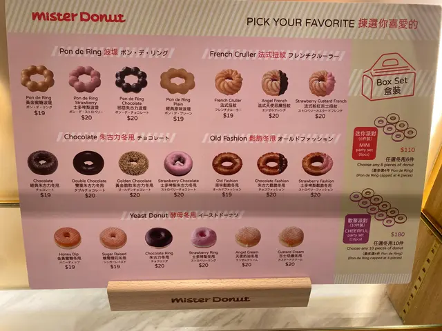 最近喺地鐵站附近經過Mister Donut,忍唔住買咗幾個甜甜圈試試,結果真是一個驚喜!Mister Donut嘅甜甜圈真心好食,口感同味道都令人滿足。店舖環境乾淨整潔,甜甜圈款式多到眼花繚亂,有經典嘅原味、朱古力,仲有日式風味嘅抹茶同紅豆款,每款都好吸引。我揀咗一個朱古力醬甜甜圈同一個抹茶味嘅Pon de Ring。朱古力醬甜而不膩,塗得均勻,每一啖都充滿濃郁嘅可可香,配上鬆軟嘅甜甜圈麵團,口感一流!Pon de Ring就係Mister Donut嘅招牌,Q彈有嚼勁,抹茶味清新自然,完全唔會太甜,食完仲有陣陣茶香留喺口。份量啱啱好,唔會太飽膩,啱晒當下午茶或者小食。店員服務態度親切,包裝都好精美,拎上手都覺得有質感。價錢方面,雖然比一般麵包店略貴,但質素絕對值回票價!下次經過地鐵站,仲會想再買嚐嚐其他口味,特別係季節限定款。總之,Mister Donut真是一個甜品控嘅天堂,強烈推介俾鍾意甜食嘅朋友!…查看更多