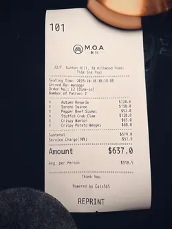 居高臨下的天台酒吧,可以全方位眺望城中風景,今次就來到位於尖沙咀的 MOA 秋月,紅黑配色設計時尚有格調,戶外位置景觀開揚,入夜後璀燦迷人夜景盡入眼簾,在如此醉人景色下品酒,徘徊在微醺與清醒之間,夢幻唯美的酒吧酒藏齊全多樣,在昏黃柔和的燈光映照下,猶如被浪漫迷醉氛圍包圍,餐牌主打特色雞尾酒,最近推出秋季限定新款式,此外亦供應佐酒小食,款式中西合璧,感受東方韻味與現代調酒藝術的碰撞,入座後奉上Welcome drink,酸梅汁酸甜消暑,挑起舌頭的慾望,喚醒沉睡的味蕾。還原靚靚拳 $138招牌雞尾酒配搭破格創新,揉合醇厚的發酵米酒、法國白酒、甘甜的桂花陳年橘皮糖漿,矜貴燕窩可以單吃或拌入酒中,滋補養顏,將甜美與微醺交織。秋菊 $128秋季推出的新品特調,頂層氣泡酒增添層次,以Two Moons Signature干氈酒為基底,酒味層層遞進,味道細緻平衡,滲出菊花的清幽花香餘韻。百花釀蟹鉗 $128 自家製釀蟹鉗大隻厚肉,外層炸至金黃酥脆,內餡扎實彈牙,飽滿鮮甜,點些秘製醬汁更加惹味開胃,中和炸物本身的膩感。港式雲吞 $65炸雲吞外皮輕薄脆身,結實肉餡保留豐滿肉汁,沾上微辣醬汁,溫暖辣感增添味蕾上的刺激。東北黑椒牛肉燒賣 $55蒸籠上熱氣騰騰,不論造型還是味道,有別於一般燒賣,薄身有嚼勁的燒賣外皮裹滿綿軟中帶著黏性的糯米飯,混合牛肉碎、即磨黑胡椒和菇菌,展現中式點心無限的可塑性。土匪薯角 $68薯角連著薯皮焗得金黃酥脆,肉心軟綿細密,佐以濃郁香辣的孜然香料,香氣撲鼻,帶來層層疊疊的椒麻韻味。…查看更多