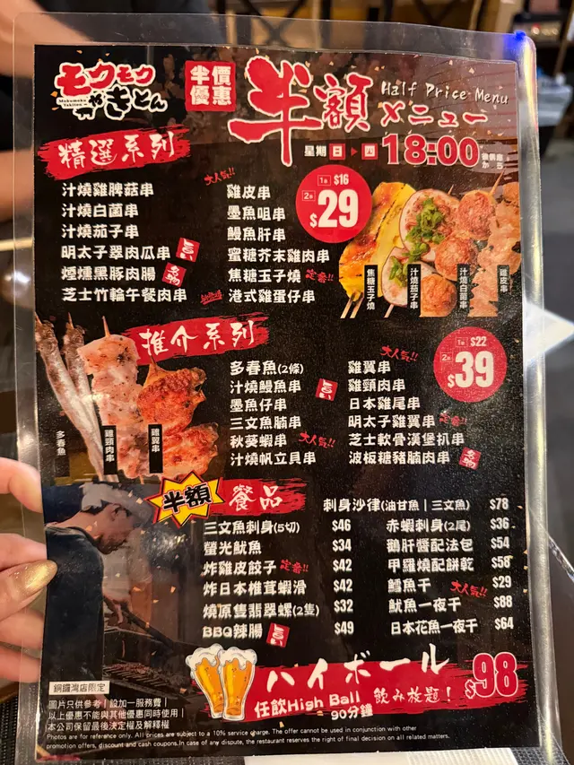 ✦ 豬小腸 $34@1✦ 豬生腸 $34@1 ✦ 九條蔥豚肉卷 $34✦ 豬大腸串 $36@1✦ 西班牙黑豚肩肉串 $38@1✦ 西班牙黑豚豬頸肉 $38@1✦ 西班牙夾心肉 $38@1✦ 豬顎骨 $38@1✦ 露筍豬肉卷 $38✦ 鹽燒鮑魚 $38|飲品✦巨峰味汽酒 $46✦巨峰梳打 $38…查看更多
